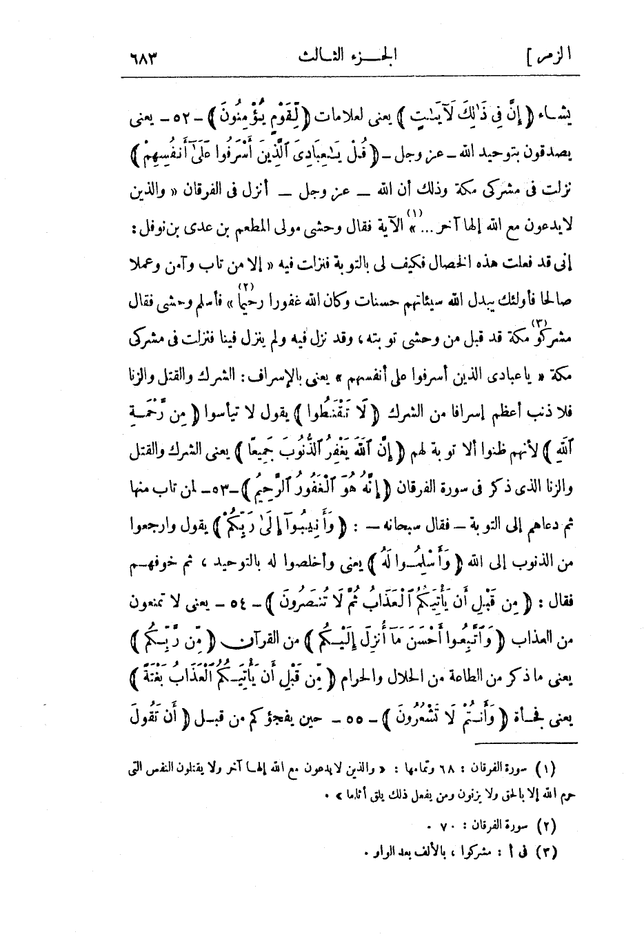 (1) سورة الفرقان: 68 وتمامها: «وَالَّذِينَ لا يَدْعُونَ مَعَ اللَّهِ إِلهاً آخَرَ وَلا يَقْتُلُونَ النَّفْسَ الَّتِي حَرَّمَ اللَّهُ إِلَّا بِالْحَقِّ وَلا يَزْنُونَ وَمَنْ يَفْعَلْ ذلِكَ يَلْقَ أَثاماً» .