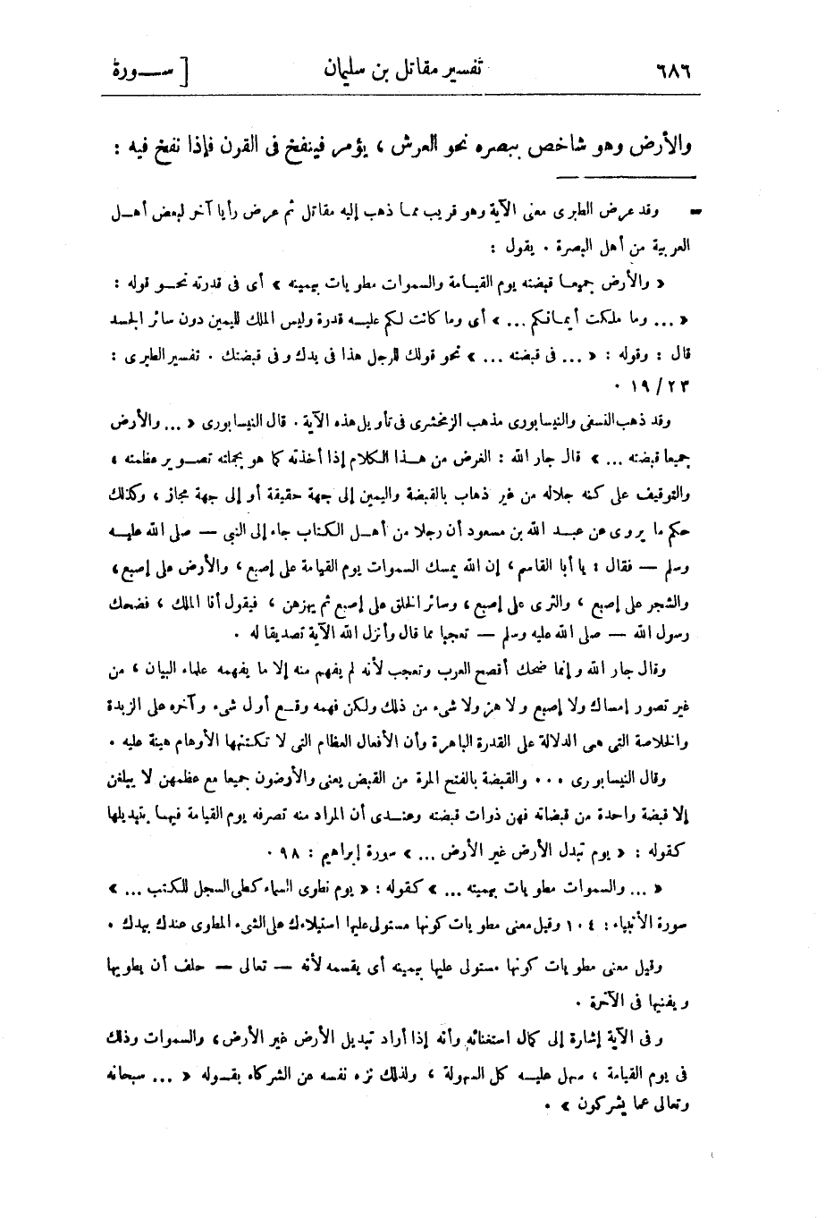 يروى عن عبد الله بن مسعود أن رجلا من أهل الكتاب جاء إلى النبي- صلى الله عليه وسلم- فقال: يا أبا القاسم، إن الله يمسك السموات يوم القيامة على إصبع، والأرض على إصبع، والشجر على إصبع، والثرى على إصبع، وسائر الخلق على إصبع ثم يهزهن، فيقول أنا الملك، فضحك رسول الله- صلّى الله عليه وسلم- تعجبا مما قال وأنزل الله الآية تصديقا له.