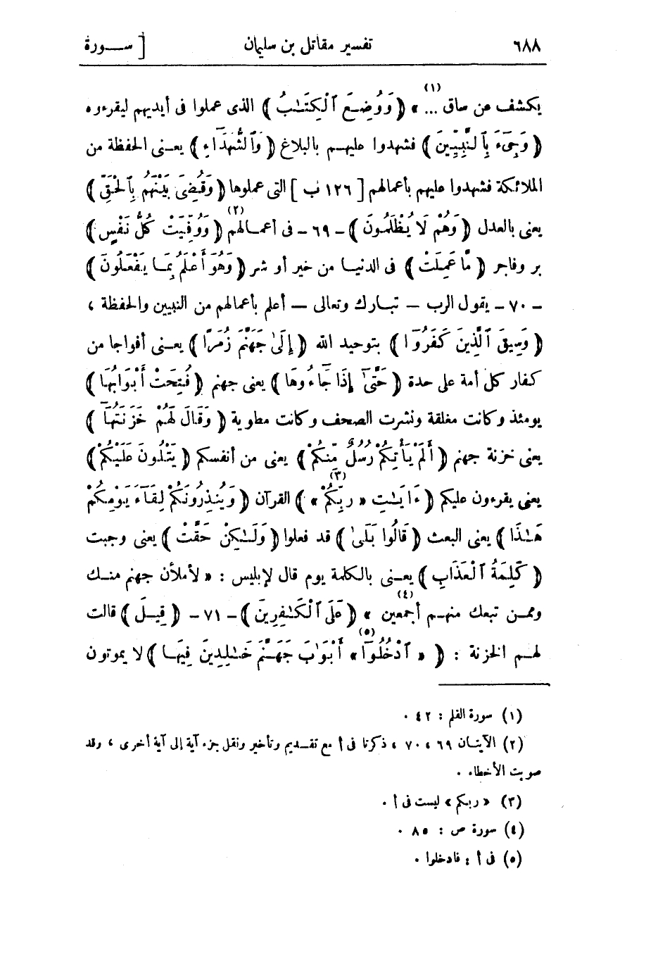 يكشف عن ساق ... » «1» وَوُضِعَ الْكِتابُ الذي عملوا فى أيديهم ليقرؤه وَجِيءَ بِالنَّبِيِّينَ فشهدوا عليهم بالبلاغ وَالشُّهَداءِ يعني الحفظة من الملائكة فشهدوا عليهم بأعمالهم [126 ب] التي عملوها وَقُضِيَ بَيْنَهُمْ بِالْحَقِّ يعنى بالعدل وَهُمْ لا يُظْلَمُونَ- 69- فى أعمالهم «2» وَوُفِّيَتْ كُلُّ نَفْسٍ بر وفاجر مَا عَمِلَتْ في الدنيا من خير أو شر وَهُوَ أَعْلَمُ بِما يَفْعَلُونَ- 70- يقول الرب- تبارك وتعالى- أعلم بأعمالهم من النبيين والحفظة، وَسِيقَ الَّذِينَ كَفَرُوا بتوحيد الله إِلى جَهَنَّمَ زُمَراً يعني أفواجا من كفار كل أمة على حدة حَتَّى إِذا جاؤُها يعني جهنم فُتِحَتْ أَبْوابُها يومئذ وكانت مغلقة ونشرت الصحف وكانت مطوية وَقالَ لَهُمْ خَزَنَتُها يعني خزنة جهنم أَلَمْ يَأْتِكُمْ رُسُلٌ مِنْكُمْ يعني من أنفسكم يَتْلُونَ عَلَيْكُمْ يعني يقرءون عليكم آياتِ «رَبِّكُمْ» «3» القرآن وَيُنْذِرُونَكُمْ لِقاءَ يَوْمِكُمْ هذا يعني البعث قالُوا بَلى قد فعلوا وَلكِنْ حَقَّتْ يعني وجبت كَلِمَةُ الْعَذابِ يعني بالكلمة يوم قال لإبليس: «لَأَمْلَأَنَّ جَهَنَّمَ مِنْكَ وَمِمَّنْ تَبِعَكَ مِنْهُمْ أَجْمَعِينَ» «4» عَلَى الْكافِرِينَ- 71- قِيلَ قالت لهم الخزنة: «ادْخُلُوا» «5» أَبْوابَ جَهَنَّمَ خالِدِينَ فِيها لا يموتون
