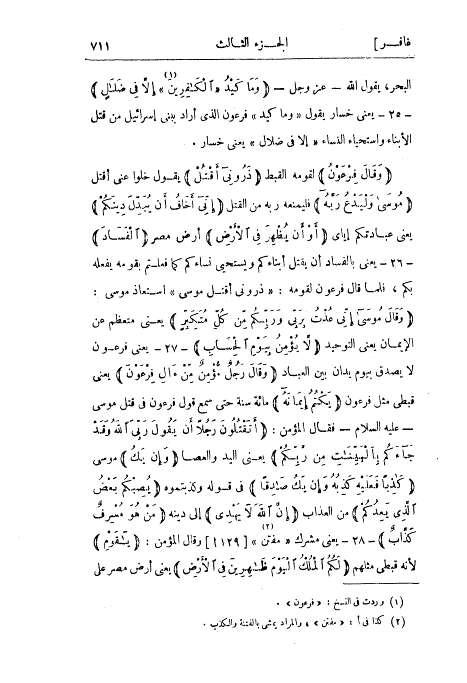 البحر، يقول الله- عز وجل- وَما كَيْدُ «الْكافِرِينَ» «1» إِلَّا فِي ضَلالٍ- 25- يعني خسار يقول «وَمَا كَيْدُ» فرعون الذي أراد ببني إسرائيل من قتل الأبناء واستحياء النساء «إِلَّا فِي ضَلالٍ» يعني خسار.