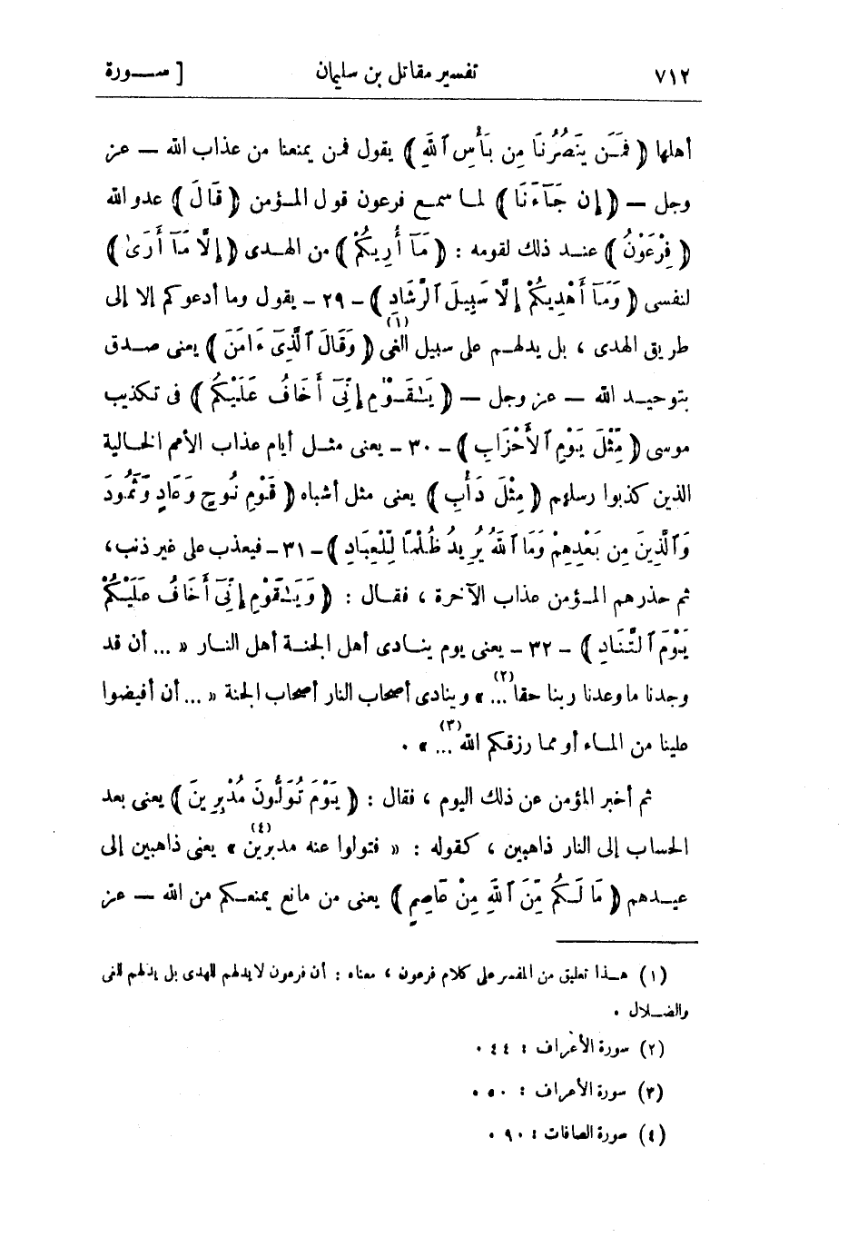 أهلها فَمَنْ يَنْصُرُنا مِنْ بَأْسِ اللَّهِ يقول فمن يمنعنا من عذاب الله- عز وجل- إِنْ جاءَنا لما سمع فرعون قول المؤمن قالَ عدو الله فِرْعَوْنُ عند ذلك لقومه: مَا أُرِيكُمْ من الهدى إِلَّا مَا أَرى لنفسي وَما أَهْدِيكُمْ إِلَّا سَبِيلَ الرَّشادِ- 29- يقول وما أدعوكم إلا إلى طريق الهدى، بل يدلهم على سبيل الغي «1» وَقالَ الَّذِي آمَنَ يعني صدق بتوحيد اللَّه- عَزَّ وَجَلّ- يَا قَوْمِ إِنِّي أَخافُ عَلَيْكُمْ فى تكذيب موسى مِثْلَ يَوْمِ الْأَحْزابِ- 30- يعني مثل أيام عذاب الأمم الخالية الذين كذبوا رسلهم مِثْلَ دَأْبِ يعني مثل أشباه قَوْمِ نُوحٍ وَعادٍ وَثَمُودَ وَالَّذِينَ مِنْ بَعْدِهِمْ وَمَا اللَّهُ يُرِيدُ ظُلْماً لِلْعِبادِ- 31- فيعذب على غير ذنب، ثم حذرهم المؤمن عذاب الآخرة، فقال: وَيا قَوْمِ إِنِّي أَخافُ عَلَيْكُمْ يَوْمَ التَّنادِ- 32- يعني يوم ينادي أهل الجنة أهل النَّارِ « ... أَنْ قَدْ وَجَدْنا مَا وَعَدَنا رَبُّنا حَقًّا ... » «2» وينادي أَصْحَابُ النَّارِ أَصْحَابَ الْجَنَّةِ « ... أَنْ أَفِيضُوا عَلَيْنا مِنَ الْماءِ أَوْ مِمَّا رَزَقَكُمُ اللَّهُ ... » «3» .