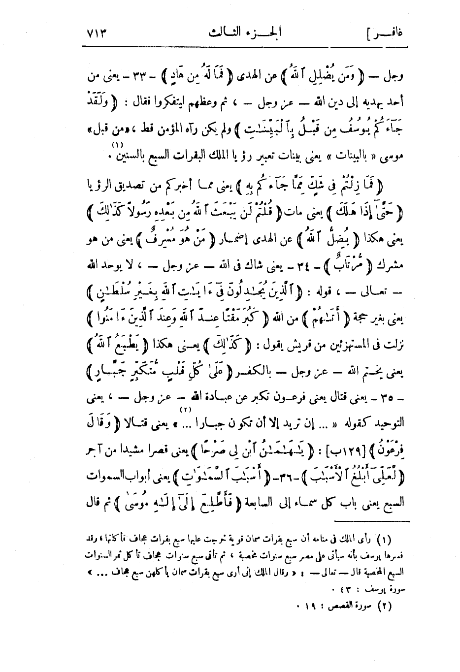 فَما زِلْتُمْ فِي شَكٍّ مِمَّا جاءَكُمْ بِهِ يعني مما أخبركم من تصديق الرؤيا حَتَّى إِذا هَلَكَ يعني مات قُلْتُمْ لَنْ يَبْعَثَ اللَّهُ مِنْ بَعْدِهِ رَسُولًا كَذلِكَ يعني هكذا يُضِلُّ اللَّهُ عن الهدى إضمار مَنْ هُوَ مُسْرِفٌ يعني من هو مشرك مُرْتابٌ- 34- يعني شاك في الله- عز وجل-، لا يوحد الله- تعالى-، قوله: الَّذِينَ يُجادِلُونَ فِي آياتِ اللَّهِ بِغَيْرِ سُلْطانٍ يعني بغير حجة أَتاهُمْ من الله كَبُرَ مَقْتاً عِنْدَ اللَّهِ وَعِنْدَ الَّذِينَ آمَنُوا نزلت في المستهزئين من قريش يقول: كَذلِكَ يعني هكذا يَطْبَعُ اللَّهُ يعني يختم الله- عز وجل- بالكفر عَلى كُلِّ قَلْبِ مُتَكَبِّرٍ جَبَّارٍ- 35- يعني قتال يعني فرعون تكبر عن عبادة الله- عز وجل-، يعني التوحيد كقوله « ... إِنْ تُرِيدُ إِلَّا أَنْ تَكُونَ جَبَّاراً ... » «2» يعنى قتالا وَقالَ فِرْعَوْنُ [129 ب] : يا هامانُ ابْنِ لِي صَرْحاً يعني قصرا مشيدا من آجر لَعَلِّي أَبْلُغُ الْأَسْبابَ- 36- أَسْبابَ السَّماواتِ يعني أبواب السموات السبع يعني باب كل سماء إلى السابعة فَأَطَّلِعَ إِلى إِلهِ مُوسى ثم قال