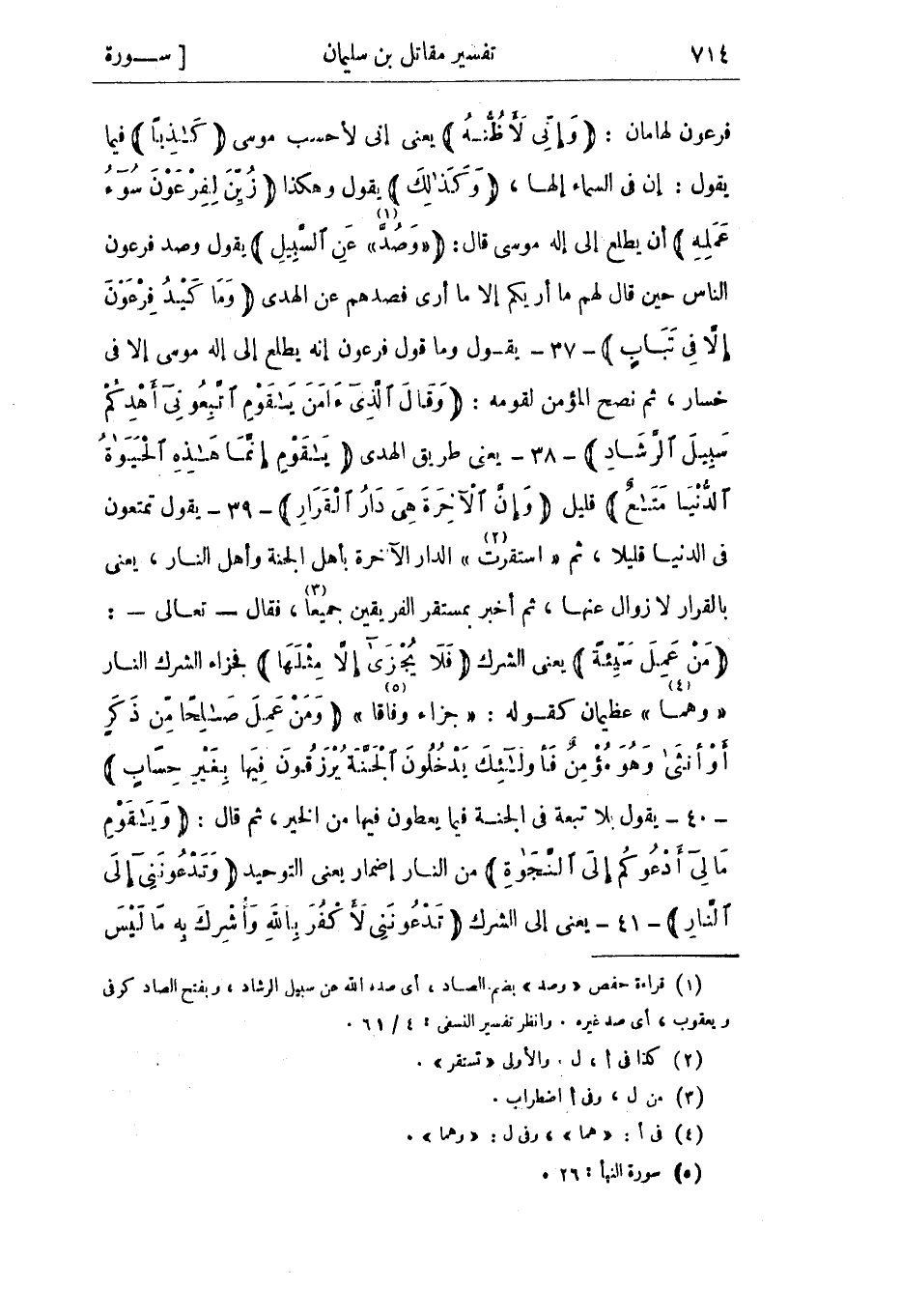 فرعون لهامان: وَإِنِّي لَأَظُنُّهُ يعني إني لأحسب موسى كاذِباً فيما يقول: إن في السماء إلها، وَكَذلِكَ يقول وهكذا زُيِّنَ لِفِرْعَوْنَ سُوءُ عَمَلِهِ أن يطلع إلى إله موسى قال: «وَصُدَّ» «1» عَنِ السَّبِيلِ يقول وصد فرعون الناس حين قال لهم ما أريكم إلا ما أرى فصدهم عن الهدى وَما كَيْدُ فِرْعَوْنَ إِلَّا فِي تَبابٍ- 37- يقول وما قول فرعون إنه يطلع إلى إله موسى إلا فى خسار، ثم نصح المؤمن لقومه: وَقالَ الَّذِي آمَنَ يا قَوْمِ اتَّبِعُونِ أَهْدِكُمْ سَبِيلَ الرَّشادِ- 38- يعني طريق الهدى يَا قَوْمِ إِنَّما هذِهِ الْحَياةُ الدُّنْيا مَتاعٌ قليل وَإِنَّ الْآخِرَةَ هِيَ دارُ الْقَرارِ- 39- يقول تمتعون في الدنيا قليلا، ثم «استقرت» «2» الدار الآخرة بأهل الجنة وأهل النار، يعني بالقرار لا زوال عنها، ثم أخبر بمستقر الفريقين جميعا «3» ، فقال- تعالى-:
