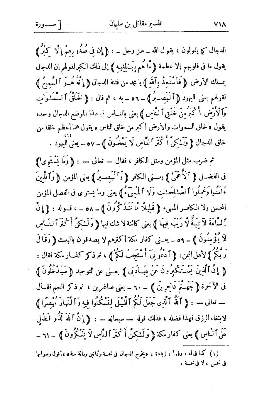 الدجال كما يقولون، يقول الله- عز وجل-: إِنْ فِي صُدُورِهِمْ إِلَّا كِبْرٌ يقول ما في قلوبهم إلا عظمة مَا هُمْ بِبالِغِيهِ إلى ذلك الكبر لقولهم إن الدجال يملك الأرض فَاسْتَعِذْ بِاللَّهِ يا محمد من فتنة الدجال إِنَّهُ هُوَ السَّمِيعُ لقولهم يعني اليهود الْبَصِيرُ- 56- به، ثم قال: لَخَلْقُ السَّماواتِ وَالْأَرْضِ أَكْبَرُ مِنْ خَلْقِ النَّاسِ يعني بالناس في هذا الموضع الدجال وحده يقول «خلق السموات والأرض أكبر من خلق الناس» يقول هما أعظم خلقا من خلق الدجال وَلكِنَّ أَكْثَرَ النَّاسِ لا يَعْلَمُونَ- 57- يعنى اليهود. «1»