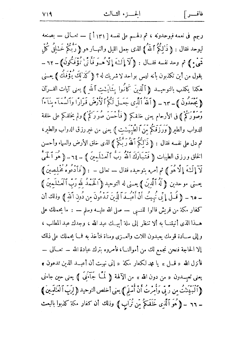 - 64- هُوَ الْحَيُّ لا إِلهَ إِلَّا هُوَ ثم أمره بتوحيده فقال- تعالى-: فَادْعُوهُ مُخْلِصِينَ يعني موحدين لَهُ الدِّينَ يعني له التوحيد الْحَمْدُ لِلَّهِ رَبِّ الْعالَمِينَ- 65- قُلْ إِنِّي نُهِيتُ أَنْ أَعْبُدَ الَّذِينَ تَدْعُونَ مِنْ دُونِ اللَّهِ وذلك أن كفار مكة من قريش قالوا للنبي- صلى الله عليه وسلم-: ما يحملك على هذا الذي أتيتنا به ألا تنظر إلى مَلَّة أبيك عبد الله، وجدك عبد المطلب، وإلى سادة قومك يعبدون اللات والعزى ومناة فتأخذ به فما يحملك عَلَى ذَلِكَ إلا الحاجة فنحن نجمع لك من أموالنا، فأمروه بترك عبادة الله- تعالى- فأنزل الله «قل» يا محمد لكفار مكة «إنى نهبت أن أعبد الَّذِينَ تَدْعُونَ» يعني تعبدون «مِنْ دُونِ اللَّهِ» من الآلهة لَمَّا جاءَنِي يعني حين جاءني الْبَيِّناتُ مِنْ رَبِّي وَأُمِرْتُ أَنْ أُسْلِمَ يعني أخلص التوحيد لِرَبِّ الْعالَمِينَ- 66- هُوَ الَّذِي خَلَقَكُمْ مِنْ تُرابٍ وذلك أن كفار مكة كذبوا بالبعث