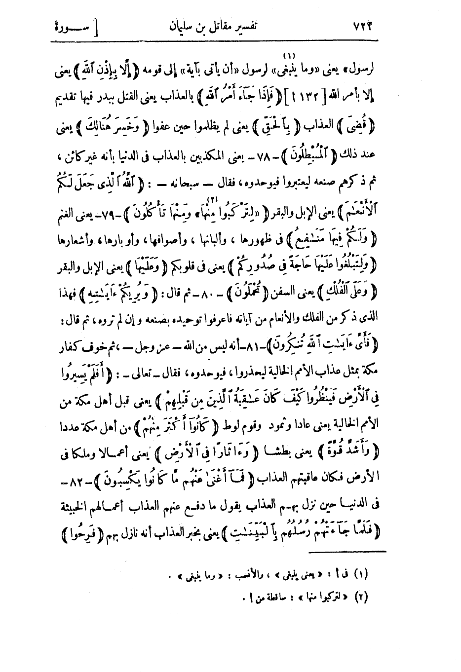 لرسول» يعني «وما ينبغي» «1» لرسول «أَنْ يَأْتِيَ بِآيَةٍ» إلى قومه إِلَّا بِإِذْنِ اللَّهِ يعني إلا بأمر الله [132 أ] فَإِذا جاءَ أَمْرُ اللَّهِ بالعذاب يعني القتل ببدر فيها تقديم قُضِيَ العذاب بِالْحَقِّ يعني لم يظلموا حين عفوا وَخَسِرَ هُنالِكَ يعني عند ذلك الْمُبْطِلُونَ- 78- يعني المكذبين بالعذاب في الدنيا بأنه غير كائن، ثم ذكرهم صنعه ليعتبروا فيوحدوه، فقال- سبحانه-: اللَّهُ الَّذِي جَعَلَ لَكُمُ الْأَنْعامَ يعني الإبل والبقر «لِتَرْكَبُوا مِنْها» «2» وَمِنْها تَأْكُلُونَ- 79- يعنى الغنم وَلَكُمْ فِيها مَنافِعُ في ظهورها، وألبانها، وأصوافها، وأوبارها، وأشعارها وَلِتَبْلُغُوا عَلَيْها حاجَةً فِي صُدُورِكُمْ يعني في قلوبكم وَعَلَيْها يعني الإبل والبقر وَعَلَى الْفُلْكِ يعني السفن تُحْمَلُونَ- 80- ثم قال: يُرِيكُمْ آياتِهِ