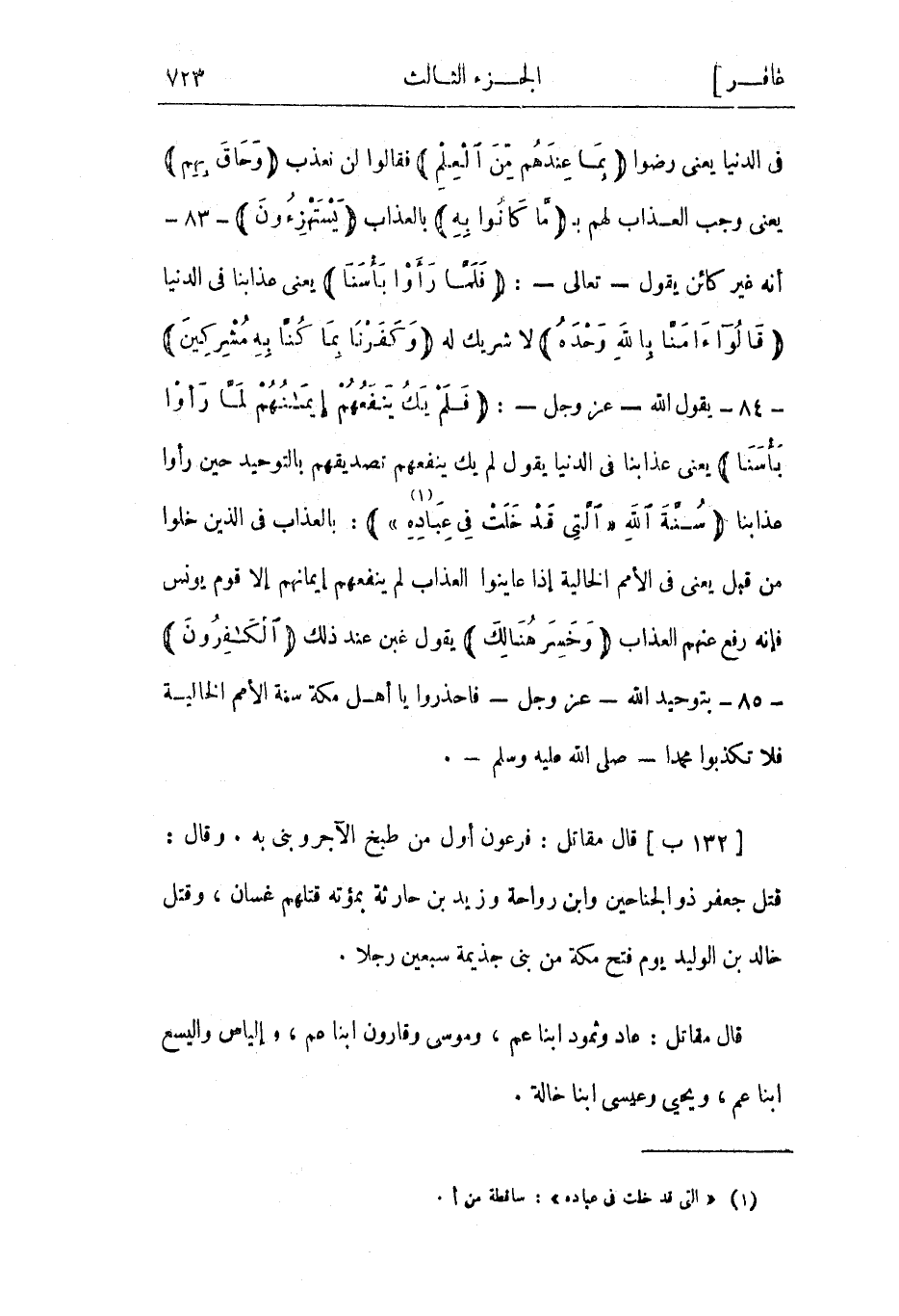في الدنيا يعني رضوا بِما عِنْدَهُمْ مِنَ الْعِلْمِ فقالوا لن نعذب وَحاقَ بِهِمْ يعني وجب العذاب لهم ب ما كانُوا بِهِ بالعذاب يَسْتَهْزِؤُنَ- 83- أنه غير كائن يقول- تعالى-: فَلَمَّا رَأَوْا بَأْسَنا يعني عذابنا في الدنيا قالُوا آمَنَّا بِاللَّهِ وَحْدَهُ لا شريك له وَكَفَرْنا بِما كُنَّا بِهِ مُشْرِكِينَ- 84- يقول الله- عز وجل-: فَلَمْ يَكُ يَنْفَعُهُمْ إِيمانُهُمْ لَمَّا رَأَوْا بَأْسَنا يعني عذابنا في الدنيا يقول لم يك ينفعهم تصديقهم بالتوحيد حين رأوا عذابنا سُنَّتَ اللَّهِ «الَّتِي قَدْ خَلَتْ فِي عِبادِهِ» «1» : بالعذاب في الذين خلوا من قبل يعني في الأمم الخالية إذا عاينوا العذاب لم ينفعهم إيمانهم إلا قوم يونس فإنه رفع عنهم العذاب وَخَسِرَ هُنالِكَ يقول غبن عند ذلك الْكافِرُونَ- 85- بتوحيد الله- عز وجل- فاحذروا يا أهل مكة سنة الأمم الخالية فلا تكذبوا محمدا- صلى الله عليه وسلم-.