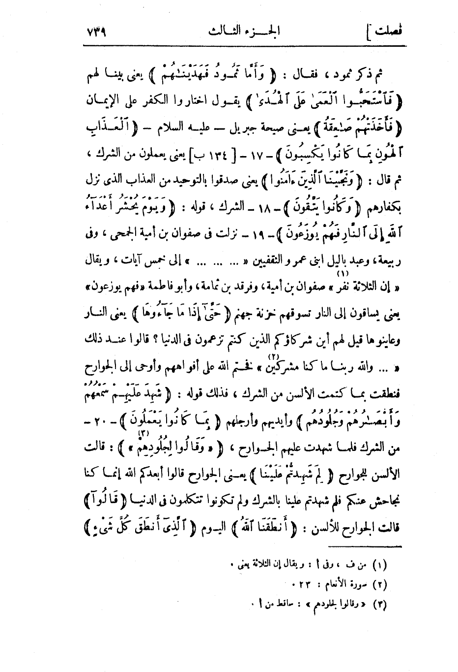 ثم ذكر ثمود، فقال: وَأَمَّا ثَمُودُ فَهَدَيْناهُمْ يعني بينا لهم فَاسْتَحَبُّوا الْعَمى عَلَى الْهُدى يقول اختاروا الكفر على الإيمان فَأَخَذَتْهُمْ صاعِقَةُ يعني صيحة جبريل- عليه السلام- الْعَذابِ الْهُونِ بِما كانُوا يَكْسِبُونَ- 17-[134 ب] يعني يعملون من الشرك، ثم قال: وَنَجَّيْنَا الَّذِينَ آمَنُوا يعني صدقوا بالتوحيد من العذاب الذي نزل بكفارهم وَكانُوا يَتَّقُونَ- 18- الشرك، قوله: وَيَوْمَ يُحْشَرُ أَعْداءُ اللَّهِ إِلَى النَّارِ فَهُمْ يُوزَعُونَ- 19- نزلت في صفوان بن أمية الجمحي، وفي ربيعة، وعبد بالليل ابني عمرو الثقفيين «.........» إلى خمس آيات، ويقال «إن الثلاثة نفر» «1» صفوان بن أمية، وفرقد بن ثمامة، وأبو فاطمة «فَهُمْ يُوزَعُونَ» يعني يساقون إلى النار تسوقهم خزنة جهنم حَتَّى إِذا ما جاؤُها يعني النار وعاينوها قيل لهم أين شركاؤكم الذين كنتم تزعمون في الدنيا؟ قالوا عند ذلك « ... وَاللَّهِ رَبِّنا ما كُنَّا مُشْرِكِينَ» «2» فختم الله على أفواهم وأوحى إلى الجوارح فنطقت بما كتمت الألسن من الشرك، فذلك قوله: شَهِدَ عَلَيْهِمْ سَمْعُهُمْ وَأَبْصارُهُمْ وَجُلُودُهُمْ وأيديهم وأرجلهم بِما كانُوا يَعْمَلُونَ- 20- من الشرك فلما شهدت عليهم الجوارح، «وَقالُوا لِجُلُودِهِمْ» «3» : قالت الألسن للجوارح لِمَ شَهِدْتُمْ عَلَيْنا يعني الجوارح قالوا أبعدكم الله إنما كنا نجاحش عنكم فلم شهدتم علينا بالشرك ولم تكونوا تتكلمون في الدنيا قالُوا قالت الجوارح للألسن: أَنْطَقَنَا اللَّهُ اليوم الَّذِي أَنْطَقَ كُلَّ شَيْءٍ