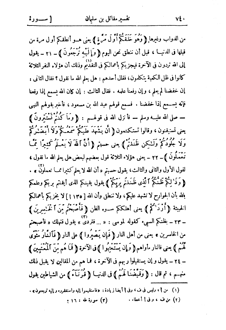 إن خفضنا لم يعلم، وإن رفعنا علمه. فقال الثالث: إن كان الله يسمع إذا رفعنا فإنه يسمع إذا خفضنا. فسمع قولهم عبد الله بن مسعود، فأخبر بقولهم النبي- صلى الله عليه وسلم- فأنزل الله في قولهم: وَما كُنْتُمْ تَسْتَتِرُونَ يعني تستيقنون، وقالوا تستكتمون أَنْ يَشْهَدَ عَلَيْكُمْ سَمْعُكُمْ وَلا أَبْصارُكُمْ وَلا جُلُودُكُمْ وَلكِنْ ظَنَنْتُمْ يعني حسبتم أَنَّ اللَّهَ لا يَعْلَمُ كَثِيراً مِمَّا تَعْمَلُونَ- 22- يعني هؤلاء الثلاثة قول بعضهم لبعض هل يعلم الله ما نقول، لقول الأول والثاني والثالث، يقول حسبتم «أَنَّ اللَّهَ لا يَعْلَمُ كَثِيرًا مِمَّا تَعْمَلُونَ» «2» .