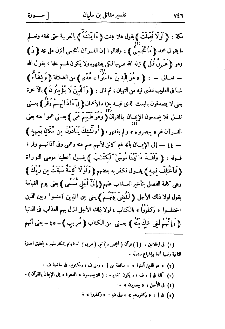 مكة: لَوْلا فُصِّلَتْ يقول هلا بينت آياتُهُ بالعربية حتى نفقه ونعلم ما يقول محمدءَ أَعْجَمِيٌّ «1» : ولقالوا إن القرآن أعجمي أنزل على محمد وَوهو عَرَبِيٌّ قُلْ نزله الله عربيا لكي يفقهوه ولا يكون لهم علة، يقول الله- تعالى-: «هُوَ لِلَّذِينَ آمَنُوا» «2» هُدىً من الضلالة وَشِفاءٌ لما في القلوب للذي فيه من التبيان، ثم قال: وَالَّذِينَ لا يُؤْمِنُونَ بالآخرة يعني لا يصدقون بالبعث الذي فيه جزاء الأعمال فِي آذانِهِمْ وَقْرٌ يعني ثقل فلا يسمعون الإيمان بالقرآن «3» وَهُوَ عَلَيْهِمْ عَمًى يعني عموا عنه يعني القرآن فلم «يبصروه» «4» ولم يفقهوه أُولئِكَ يُنادَوْنَ مِنْ مَكانٍ بَعِيدٍ- 44- إلى الإيمان بأنه غير كائن لأنهم صمٌّ عنه وعميٌ وفي آذانهم وقر، قوله: وَلَقَدْ آتَيْنا مُوسَى الْكِتابَ يقول أعطينا موسى التوراة فَاخْتُلِفَ فِيهِ يقول فكفر به بعضهم وَلَوْلا كَلِمَةٌ سَبَقَتْ مِنْ رَبِّكَ وهي كلمة الفصل بتأخير العذاب عنهم إلى أجل مسمى يعني يوم القيامة يقول لولا ذلك الأجل لَقُضِيَ بَيْنَهُمْ يعني بين الذين آمنوا وبين الذين اختلفوا «وكفروا» «5» بالكتاب، لولا ذلك الأجل لنزل بهم العذاب فى الدنيا وَإِنَّهُمْ لَفِي شَكٍّ مِنْهُ يعنى من الكتاب مُرِيبٍ- 45- يعنى أنهم