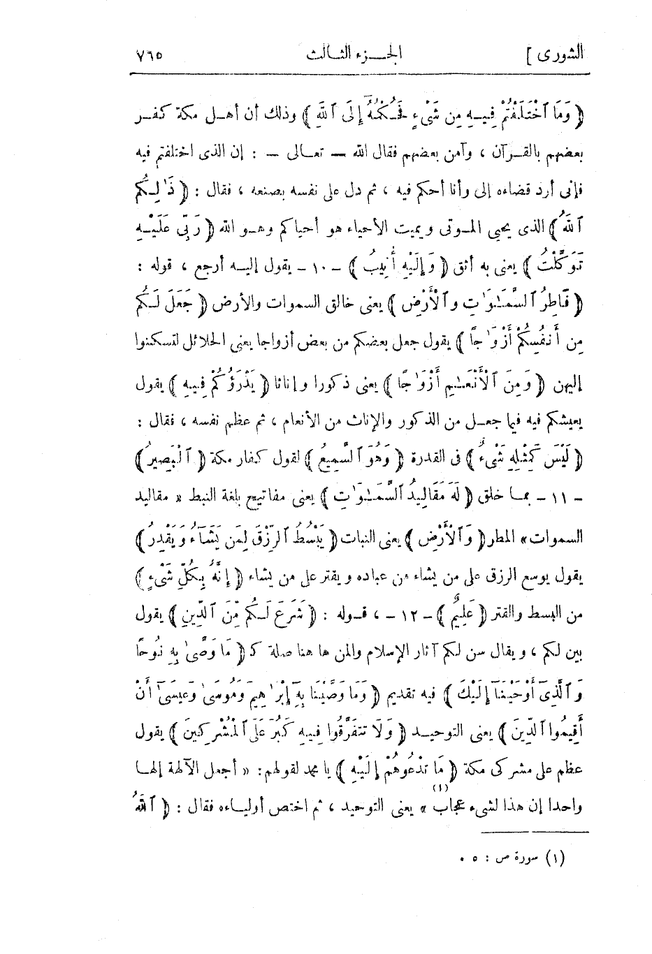 وَمَا اخْتَلَفْتُمْ فِيهِ مِنْ شَيْءٍ فَحُكْمُهُ إِلَى اللَّهِ وذلك أن أهل مكة كفر بعضهم بالقرآن، وآمن بعضهم فقال الله- تعالى-: إن الذي اختلفتم فيه فإني أرد قضاءه إلي وأنا أحكم فيه، ثم دل على نفسه بصنعه، فقال: ذلِكُمُ اللَّهُ الذي يحيي الموتى ويميت الأحياء هو أحياكم وهو الله رَبِّي عَلَيْهِ تَوَكَّلْتُ يعني به أثق وَإِلَيْهِ أُنِيبُ- 10- يقول إليه أرجع، قوله: