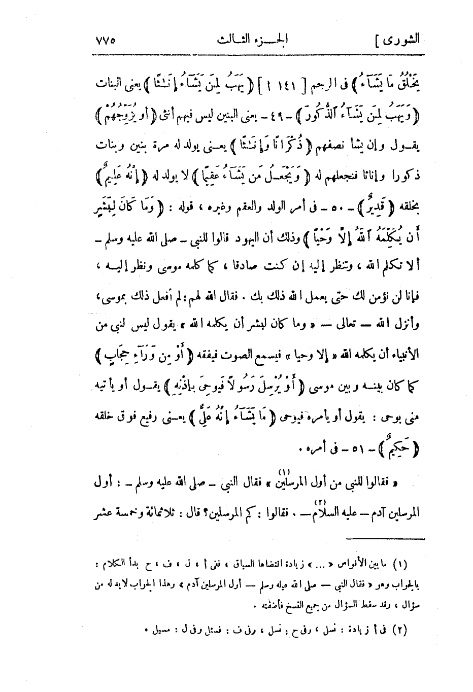 فى الرحم [141 أ] يَهَبُ لِمَنْ يَشاءُ إِناثاً يعنى البنات وَيَهَبُ لِمَنْ يَشاءُ الذُّكُورَ- 49- يعنى البنين ليس فيهم أنثى أَوْ يُزَوِّجُهُمْ يقول وإن يشأ نصفهم ذُكْراناً وَإِناثاً يعني يولد له مرة بنين وبنات ذكورا وإناثا فنجعلهم له وَيَجْعَلُ مَنْ يَشاءُ عَقِيماً لا يولد له إِنَّهُ عَلِيمٌ بخلقه قَدِيرٌ- 50- في أمر الولد والعقم وغيره، قوله: وَما كانَ لِبَشَرٍ أَنْ يُكَلِّمَهُ اللَّهُ إِلَّا وَحْياً وذلك أن اليهود قالوا للنبي- صلى الله عليه وسلم- ألا تكلم الله، وتنظر إليه إن كنت صادقا، كما كلمه موسى ونظر إليه، فإنا لن نؤمن لك حتى يعمل الله ذلك بك. فقال الله لهم: لم أفعل ذلك بموسى، وأنزل الله- تعالى- «وَما كانَ لِبَشَرٍ أَنْ يُكَلِّمَهُ اللَّهُ» يقول ليس لنبي من الأنبياء أن يكلمه الله «إِلا وَحْيًا» فيسمع الصوت فيفقه أَوْ مِنْ وَراءِ حِجابٍ كما كان بينه وبين موسى أَوْ يُرْسِلَ رَسُولًا فَيُوحِيَ بِإِذْنِهِ يقول أو يأتيه مني بوحي: يقول أو يأمره فيوحى ما يَشاءُ إِنَّهُ عَلِيٌّ يعني رفيع فوق خلقه حَكِيمٌ- 51- في أمره.