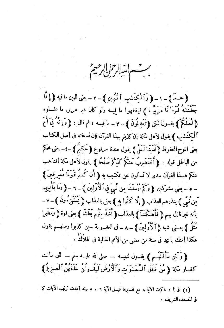 بِسْمِ اللَّهِ الرَّحْمنِ الرَّحِيمِ حم- 1- وَالْكِتابِ الْمُبِينِ- 2- يعنى البين ما فيه إِنَّا جَعَلْناهُ قُرْآناً عَرَبِيًّا ليفقهوا ما فيه ولو كان غير عربي ما عقلوه لَعَلَّكُمْ يقول لكي تَعْقِلُونَ- 3- ما فيه، ثم قال: وَإِنَّهُ فِي أُمِّ الْكِتابِ يقول لأهل مكة إن كذبتم بهذا القرآن فإن نسخته في أصل الكتاب يعني اللوح المحفوظ لَدَيْنا لَعَلِيٌّ يقول عندنا مرفوع حَكِيمٌ- 4- يعني محكم من الباطل قوله: أَفَنَضْرِبُ عَنْكُمُ الذِّكْرَ صَفْحاً يقول لأهل مكة أفنذهب عنكم هذا القرآن سدى لا تسألون عن تكذيب به أَنْ كُنْتُمْ قَوْماً مُسْرِفِينَ- 5- يعني مشركين وَكَمْ أَرْسَلْنا مِنْ نَبِيٍّ فِي الْأَوَّلِينَ- 6- وَما يَأْتِيهِمْ مِنْ نَبِيٍّ ينذرهم العذاب إِلَّا كانُوا بِهِ يعنى بالعذاب يَسْتَهْزِؤُنَ- 7- بأنه غير نازل بهم فَأَهْلَكْنا بالعذاب أَشَدَّ مِنْهُمْ بَطْشاً يعني قوة وَمَضى مَثَلُ يعني شبه الْأَوَّلِينَ- 8- في العقوبة حين كذبوا رسلهم يقول هكذا أمتك يا محمد في سنة من مضى من الأمم الخالية في الهلاك «1» .