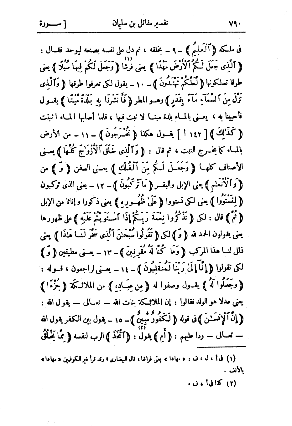 الَّذِي جَعَلَ لَكُمُ الْأَرْضَ مَهْداً يعنى فرشا «1» وَجَعَلَ لَكُمْ فِيها سُبُلًا يعني طرقا تسلكونها لَعَلَّكُمْ تَهْتَدُونَ- 10- يقول لكي تعرفوا طرقها وَالَّذِي نَزَّلَ مِنَ السَّماءِ مَاءً بِقَدَرٍ وهو المطر فَأَنْشَرْنا بِهِ بَلْدَةً مَيْتاً يقول فأحيينا به، يعني بالماء بلدة ميتا لا نبت فيها، فلما أصابها الماء أنبتت كَذلِكَ [142 أ] يقول هكذا تُخْرَجُونَ- 11- من الأرض بالماء كما يخرج النبت، ثم قال: وَالَّذِي خَلَقَ الْأَزْواجَ كُلَّها يعني الأصناف كلها وَجَعَلَ لَكُمْ مِنَ الْفُلْكِ يعني السفن وَمن وَالْأَنْعامِ يعني الإبل والبقر مَا تَرْكَبُونَ- 12- يعني الذي تركبون لِتَسْتَوُوا يعني لكي تستووا عَلى ظُهُورِهِ يعني ذكورا وإناثا من الإبل ثُمَّ قال: لكي تَذْكُرُوا نِعْمَةَ رَبِّكُمْ إِذَا اسْتَوَيْتُمْ عَلَيْهِ على ظهورها يعني يقولون الحمد لله وَلكي تَقُولُوا سُبْحانَ الَّذِي سَخَّرَ لَنا هذا يعني ذلل لنا هذا المركب وَما كُنَّا لَهُ مُقْرِنِينَ- 13- يعنى مطيقين وَلكي تقولوا إِنَّا إِلى رَبِّنا لَمُنْقَلِبُونَ- 14- يعني لراجعون، قوله: