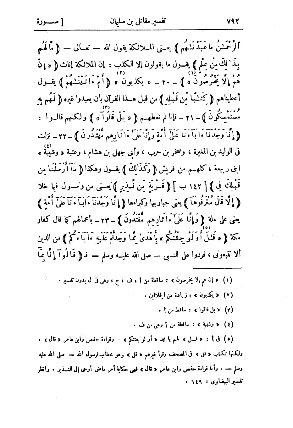 إِنَّا وَجَدْنا آباءَنا عَلى أُمَّةٍ وَإِنَّا عَلى آثارِهِمْ مُهْتَدُونَ- 22- نزلت في الوليد بن المغيرة، وصخر بن حرب، وأبي جهل بن هشام، وعتبة «وشيبة» «4» ابني ربيعة، كلهم من قريش وَكَذلِكَ يقول وهكذا ما أَرْسَلْنا مِنْ قَبْلِكَ فِي [142 ب] قَرْيَةٍ مِنْ نَذِيرٍ يعني من رسول فيما خلا إِلَّا قالَ مُتْرَفُوها يعني جباريها وكبراءها إِنَّا وَجَدْنا آباءَنا عَلى أُمَّةٍ يعني على ملة وَإِنَّا عَلى آثارِهِمْ مُقْتَدُونَ- 23- بأعمالهم كما قال كفار مكة «قالَ» «5» أَوَلَوْ جِئْتُكُمْ» بِأَهْدى مِمَّا وَجَدْتُمْ عَلَيْهِ آباءَكُمْ من الدين ألا تتبعوني، فردوا على النبي- صلى الله عليه وسلم- ف قالُوا إِنَّا بِما أُرْسِلْتُمْ بِهِ كافِرُونَ