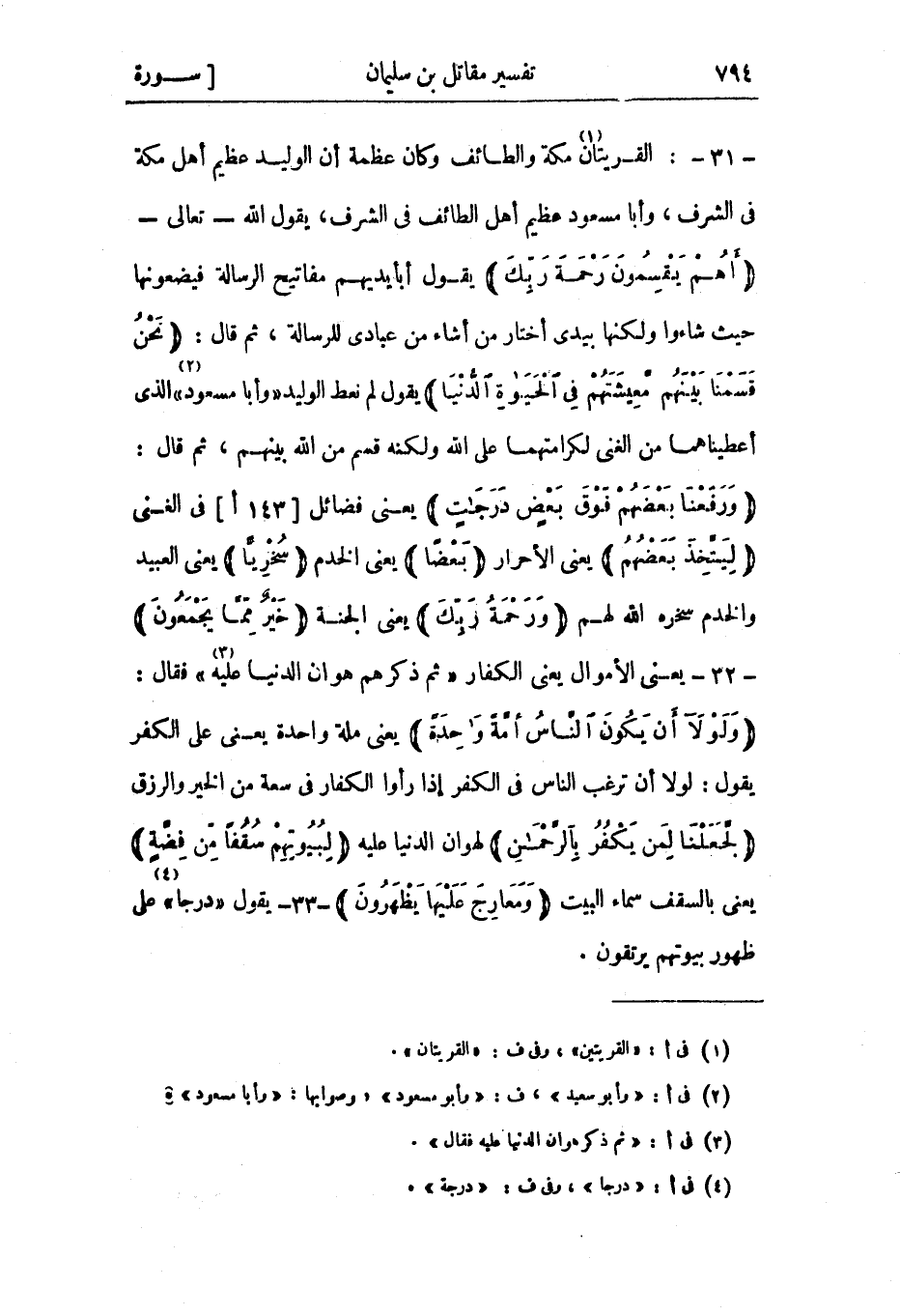 وَرَفَعْنا بَعْضَهُمْ فَوْقَ بَعْضٍ دَرَجاتٍ يعنى فضائل [143 أ] في الغنى لِيَتَّخِذَ بَعْضُهُمْ يعني الأحرار بَعْضاً يعني الخدم سُخْرِيًّا يعني العبيد والخدم سخره الله لهم وَرَحْمَتُ رَبِّكَ يعني الجنة خَيْرٌ مِمَّا يَجْمَعُونَ 32- يعني الأموال يعني الكفار «ثم ذكرهم هوان الدنيا عليه» «3» فقال: