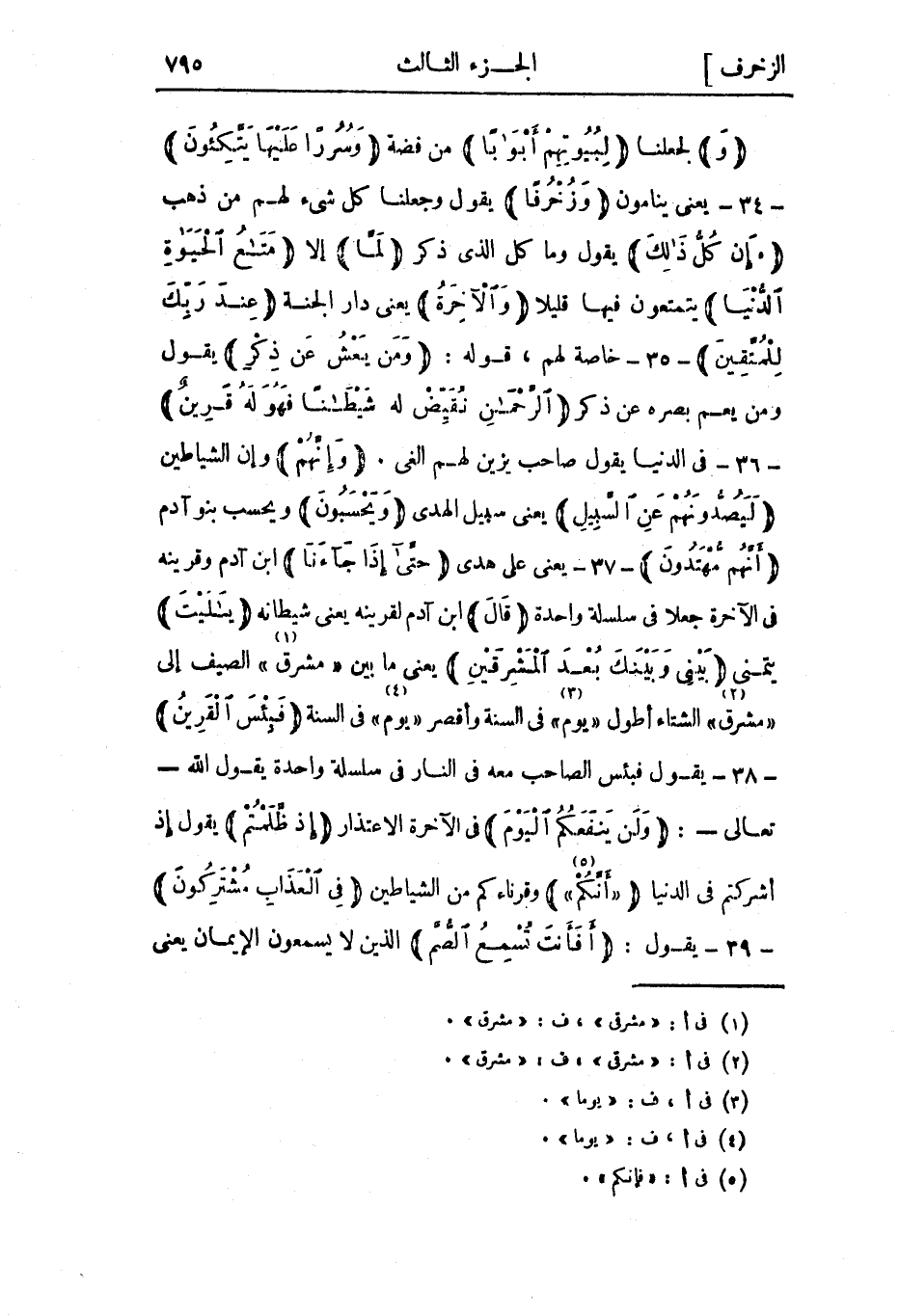 وَلجعلنا لِبُيُوتِهِمْ أَبْواباً من فضة وَسُرُراً عَلَيْها يَتَّكِؤُنَ- 34- يعني ينامون وَزُخْرُفاً يقول وجعلنا كل شيء لهم من ذهب إِنْ كُلُّ ذلِكَ يقول وما كل الذي ذكر لَمَّا إلا مَتاعُ الْحَياةِ الدُّنْيا يتمتعون فيها قليلا وَالْآخِرَةُ يعني دار الجنة عِنْدَ رَبِّكَ لِلْمُتَّقِينَ- 35- خاصة لهم، قوله: وَمَنْ يَعْشُ عَنْ ذِكْرِ يقول ومن يعم بصره عن ذكر الرَّحْمنِ نُقَيِّضْ لَهُ شَيْطاناً فَهُوَ لَهُ قَرِينٌ- 36- فى الدنيا يقول صاحب بزين لهم الغي. وَإِنَّهُمْ وإن الشياطين لَيَصُدُّونَهُمْ عَنِ السَّبِيلِ يعني سبيل الهدى وَيَحْسَبُونَ ويحسب بنو آدم أَنَّهُمْ مُهْتَدُونَ- 37- يعني على هدى حَتَّى إِذا جاءَنا ابن آدم وقرينه في الآخرة جعلا في سلسلة واحدة قالَ ابن آدم لقرينه يعني شيطانه يَا لَيْتَ يتمنى بَيْنِي وَبَيْنَكَ بُعْدَ الْمَشْرِقَيْنِ يعني ما بين «مشرق» «1» الصيف إلى «مشرق» «2» الشتاء أطول «يوم» «3» في السنة وأقصر «يوم» «4» في السنة فَبِئْسَ الْقَرِينُ- 38- يقول فبئس الصاحب معه فى النار فى سلسلة واحدة يقول الله- تعالى-: وَلَنْ يَنْفَعَكُمُ الْيَوْمَ في الآخرة الاعتذار إِذْ ظَلَمْتُمْ يقول إذ أشركتم في الدنيا «أَنَّكُمْ» «5» وقرناءكم من الشياطين فِي الْعَذابِ مُشْتَرِكُونَ- 39- يقول: أَفَأَنْتَ تُسْمِعُ الصُّمَّ الذين لا يسمعون الإيمان يعنى