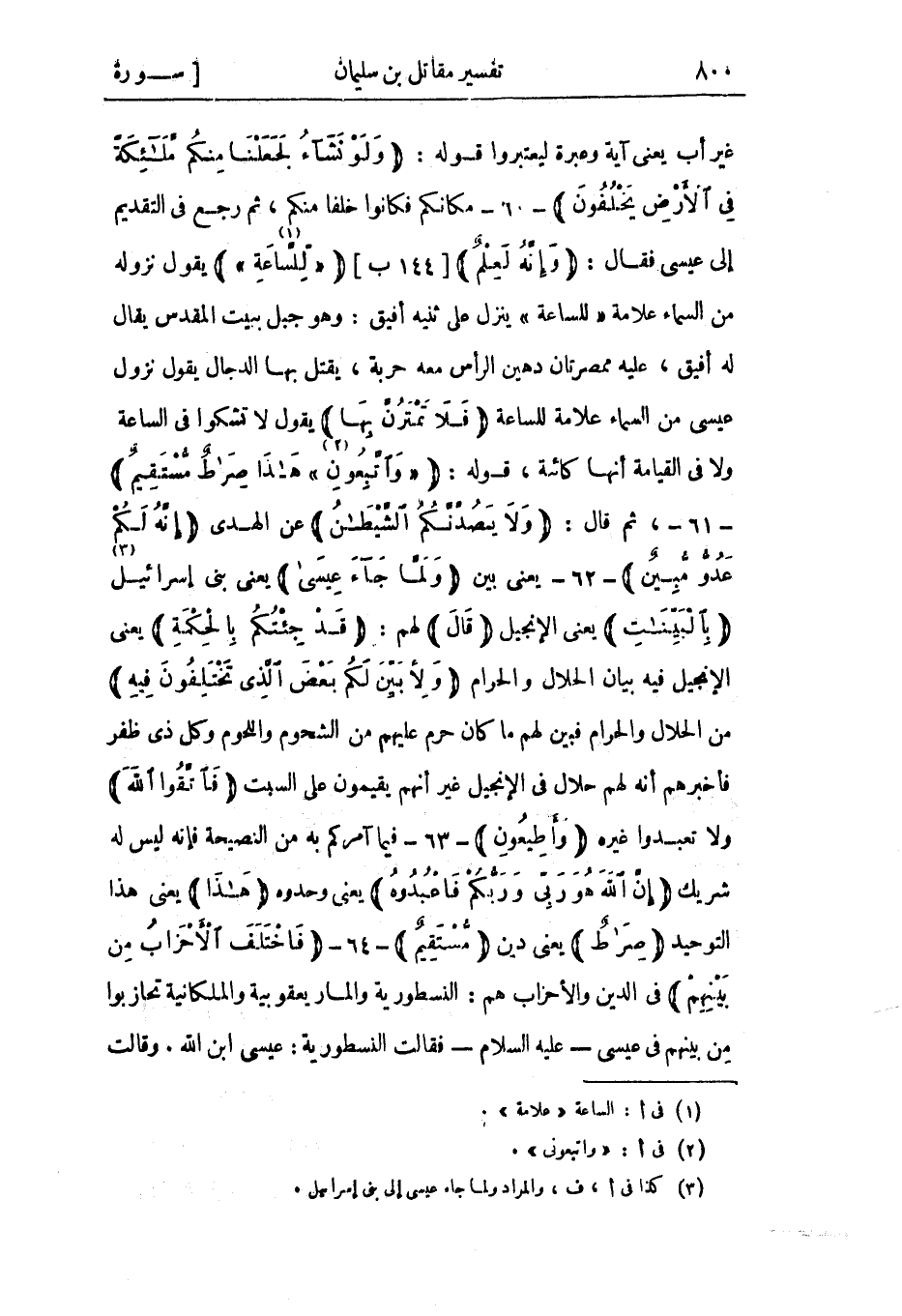 غير أب يعني آية وعبرة ليعتبروا قوله: وَلَوْ نَشاءُ لَجَعَلْنا مِنْكُمْ مَلائِكَةً فِي الْأَرْضِ يَخْلُفُونَ- 60- مكانكم فكانوا خلفا منكم، ثم رجع في التقديم إلى عيسى فقال: وَإِنَّهُ لَعِلْمٌ [144 ب] «لِلسَّاعَةِ» «1» يقول نزوله من السماء علامة «للساعة» ينزل على ثنية أفيق: وهو جبل بيت المقدس يقال له أفيق، عليه ممصرتان دهين الرأس معه حربة، يقتل بها الدجال يقول نزول عيسى من السماء علامة للساعة فَلا تَمْتَرُنَّ بِها يقول لا تشكوا في الساعة ولا في القيامة أنها كائنة، قوله: «وَاتَّبِعُونِ» «2» هَذَا صِراطٌ مُسْتَقِيمٌ- 61-، ثم قال: وَلا يَصُدَّنَّكُمُ الشَّيْطانُ عن الهدى إِنَّهُ لَكُمْ عَدُوٌّ مُبِينٌ- 62- يعنى بين وَلَمَّا جاءَ عِيسى يعني بني إسرائيل «3» بِالْبَيِّناتِ يعني الإنجيل قالَ لهم: قَدْ جِئْتُكُمْ بِالْحِكْمَةِ يعني الإنجيل فيه بيان الحلال والحرام وَلِأُبَيِّنَ لَكُمْ بَعْضَ الَّذِي تَخْتَلِفُونَ فِيهِ من الحلال والحرام فبين لهم ما كان حرم عليهم من الشحوم واللحوم وكل ذي ظفر فأخبرهم أنه لهم حلال في الإنجيل غير أنهم يقيمون على السبت فَاتَّقُوا اللَّهَ ولا تعبدوا غيره وَأَطِيعُونِ- 63- فيما آمركم به من النصيحة فَإنَّهُ ليس له شريك إِنَّ اللَّهَ هُوَ رَبِّي وَرَبُّكُمْ فَاعْبُدُوهُ يعني وحدوه هَذَا يعني هذا التوحيد صِراطٌ يعني دين مُسْتَقِيمٌ- 64- فَاخْتَلَفَ الْأَحْزابُ مِنْ بَيْنِهِمْ فى الدين والأحزاب هم: النسطورية والمار يعقوبية والملكانية تحازبوا من بينهم في عيسى- عليه السلام- فقالت النسطورية: عيسى ابن الله. وقالت