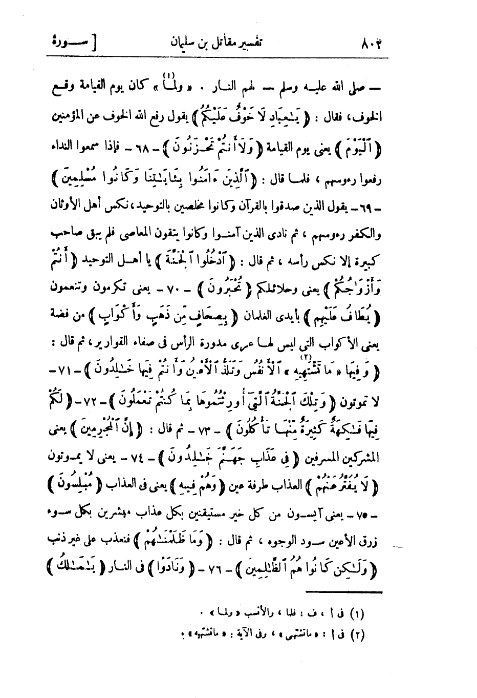 «ولما» «1» كان يوم القيامة وقع الخوف، فقال: يا عِبادِ لا خَوْفٌ عَلَيْكُمُ يقول رفع الله الخوف عن المؤمنين الْيَوْمَ يعنى يوم القيامة وَلا أَنْتُمْ تَحْزَنُونَ- 68- فإذا سمعوا النداء رفعوا رءوسهم، فلما قال: الَّذِينَ آمَنُوا بِآياتِنا وَكانُوا مُسْلِمِينَ- 69- يقول الذين صدقوا بالقرآن وكانوا مخلصين بالتوحيد، نكس أهل الأوثان والكفر رءوسهم، ثم نادى الذين آمنوا وكانوا يتقون المعاصي فلم يبق صاحب كبيرة إلا نكس رأسه، ثم قال: ادْخُلُوا الْجَنَّةَ يا أهل التوحيد أَنْتُمْ وَأَزْواجُكُمْ يعني وحلائلكم تُحْبَرُونَ- 70- يعني تكرمون وتنعمون يُطافُ عَلَيْهِمْ بأيدي الغلمان بِصِحافٍ مِنْ ذَهَبٍ وَأَكْوابٍ من فضة يعني الأكواب التي ليس لها عرى مدورة الرأس في صفاء القوارير، ثم قال: