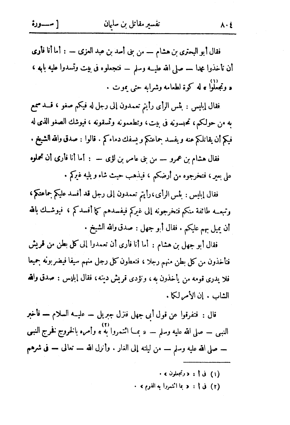 فقال إبليس: بئس الرأي، رأيتم تعمدون إلى رجل قد أفسد عليكم جماعتكم، وتبعه طائفة منكم فتخرجونه إلى غيركم فيفسدهم كما أفسدكم، فيوشك بالله أن يميل بهم عليكم. فقال أبو جهل: صدق والله الشيخ.