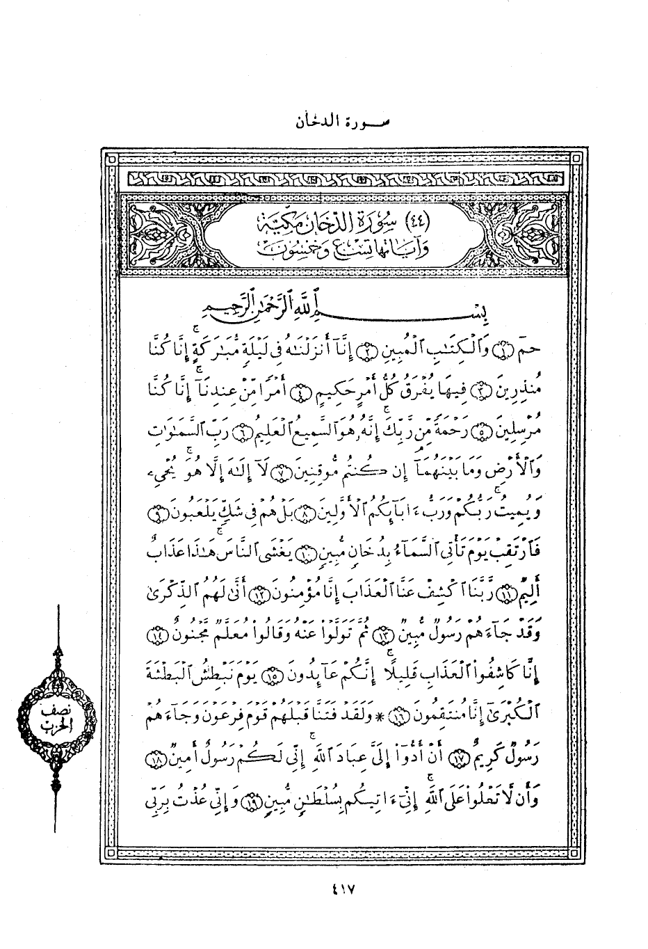 حم (1) وَالْكِتابِ الْمُبِينِ (2) إِنَّا أَنْزَلْناهُ فِي لَيْلَةٍ مُبارَكَةٍ إِنَّا كُنَّا مُنْذِرِينَ (3) فِيها يُفْرَقُ كُلُّ أَمْرٍ حَكِيمٍ (4)