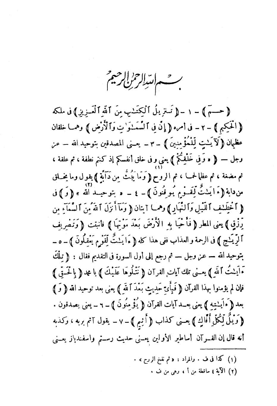 بِسْمِ اللَّهِ الرَّحْمنِ الرَّحِيمِ حم- 1- تَنْزِيلُ الْكِتابِ مِنَ اللَّهِ الْعَزِيزِ في ملكه الْحَكِيمِ- 2- في أمره إِنَّ فِي السَّماواتِ وَالْأَرْضِ وهما خلقان عظيمان لَآياتٍ لِلْمُؤْمِنِينَ- 3- يعني المصدقين بتوحيد الله- عز وجل- «وَفِي خَلْقِكُمْ يعني وفي خلق أنفسكم إذ كنتم نطفة، ثم علقة، ثم مضغة، ثم عظما لحما، ثم الروح «1» وَما يَبُثُّ مِنْ دابَّةٍ يقول وما يخلق من دابة آياتٌ لِقَوْمٍ يُوقِنُونَ- 4- «بتوحيد الله» «2» وَفى اخْتِلافِ اللَّيْلِ وَالنَّهارِ وهما آيتان وَما أَنْزَلَ اللَّهُ مِنَ السَّماءِ مِنْ رِزْقٍ يعني المطر فَأَحْيا بِهِ الْأَرْضَ بَعْدَ مَوْتِها فأنبتت وَتَصْرِيفِ الرِّياحِ في الرحمة والعذاب ففي هذا كله آياتٌ لِقَوْمٍ يَعْقِلُونَ- 5- بتوحيد الله- عز وجل- ثم رجع إلى أول السورة فى التقديم فقال: تِلْكَ آياتُ اللَّهِ يعني تلك آيات القرآن نَتْلُوها عَلَيْكَ يا محمد بِالْحَقِّ فإن لم يؤمنوا بهذا القرآن فَبِأَيِّ حَدِيثٍ بَعْدَ اللَّهِ يعنى بعد توحيد الله وَبعد آياتِهِ يعني بعد آيات القرآن يُؤْمِنُونَ- 6- يعني يصدقون.