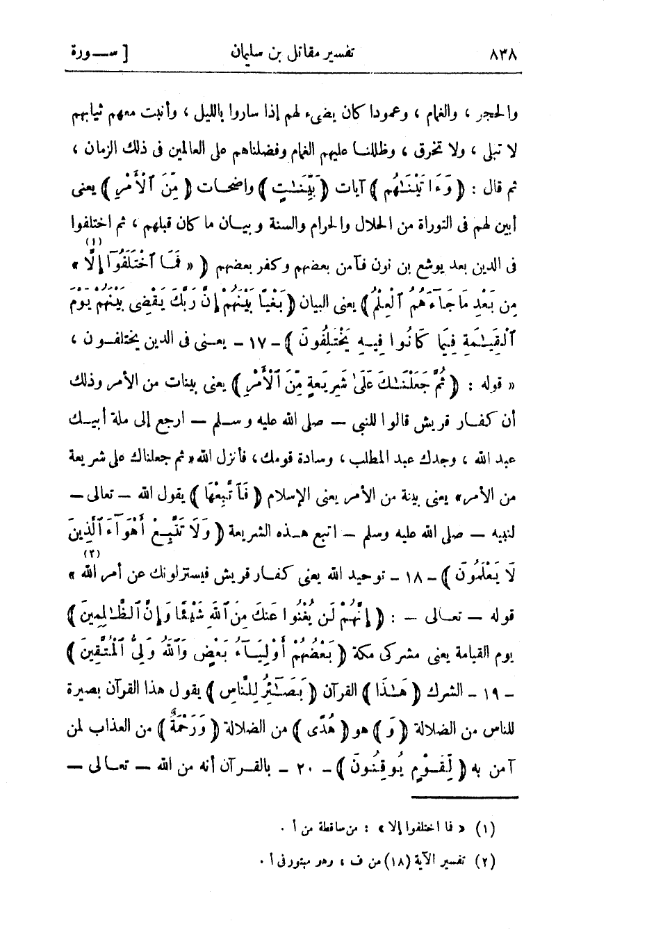 والحجر، والغمام، وعمودا كان يضيء لهم إذا ساروا بالليل، وأنبت معهم ثيابهم لا تبلى، ولا تخرق، وظللنا عليهم الغمام وفضلناهم على العالمين في ذلك الزمان، ثم قال: وَآتَيْناهُمْ آيات بَيِّناتٍ واضحات مِنَ الْأَمْرِ يعني أبين لهم فى التوراة من الحلال والحرام والسنة وبيان ما كان قبلهم، ثم اختلفوا في الدين بعد يوشع بن نون فآمن بعضهم وكفر بعضهم «فَمَا اخْتَلَفُوا إِلَّا» «1» مِنْ بَعْدِ ما جاءَهُمُ الْعِلْمُ يعني البيان بَغْياً بَيْنَهُمْ إِنَّ رَبَّكَ يَقْضِي بَيْنَهُمْ يَوْمَ الْقِيامَةِ فِيما كانُوا فِيهِ يَخْتَلِفُونَ- 17- يعني في الدين يختلفون، «قوله: ثُمَّ جَعَلْناكَ عَلى شَرِيعَةٍ مِنَ الْأَمْرِ يعني بينات من الأمر وذلك أن كفار قريش قالوا للنبي- صلى الله عليه وسلم- ارجع إلى ملة أبيك عبد الله، وجدك عبد المطلب، وسادة قومك، فأنزل الله «ثُمَّ جعلناك على شريعة من الأمر» يعني بينة من الأمر يعني الإسلام فَاتَّبِعْها يقول الله- تعالى- لنبيه- صلى الله عليه وسلم- اتبع هذه الشريعة وَلا تَتَّبِعْ أَهْواءَ الَّذِينَ لا يَعْلَمُونَ- 18- توحيد الله يعني كفار قريش فيستزلونك عن أمر الله» «2» قوله- تعالى-: إِنَّهُمْ لَنْ يُغْنُوا عَنْكَ مِنَ اللَّهِ شَيْئاً وَإِنَّ الظَّالِمِينَ يوم القيامة يعني مشركي مكة بَعْضُهُمْ أَوْلِياءُ بَعْضٍ وَاللَّهُ وَلِيُّ الْمُتَّقِينَ- 19- الشرك هَذَا القرآن بَصائِرُ لِلنَّاسِ يقول هذا القرآن بصيرة للناس من الضلالة وَهو هُدىً من الضلالة وَرَحْمَةٌ من العذاب لمن آمن به لِقَوْمٍ يُوقِنُونَ- 20- بالقرآن أنه من الله- تعالى-