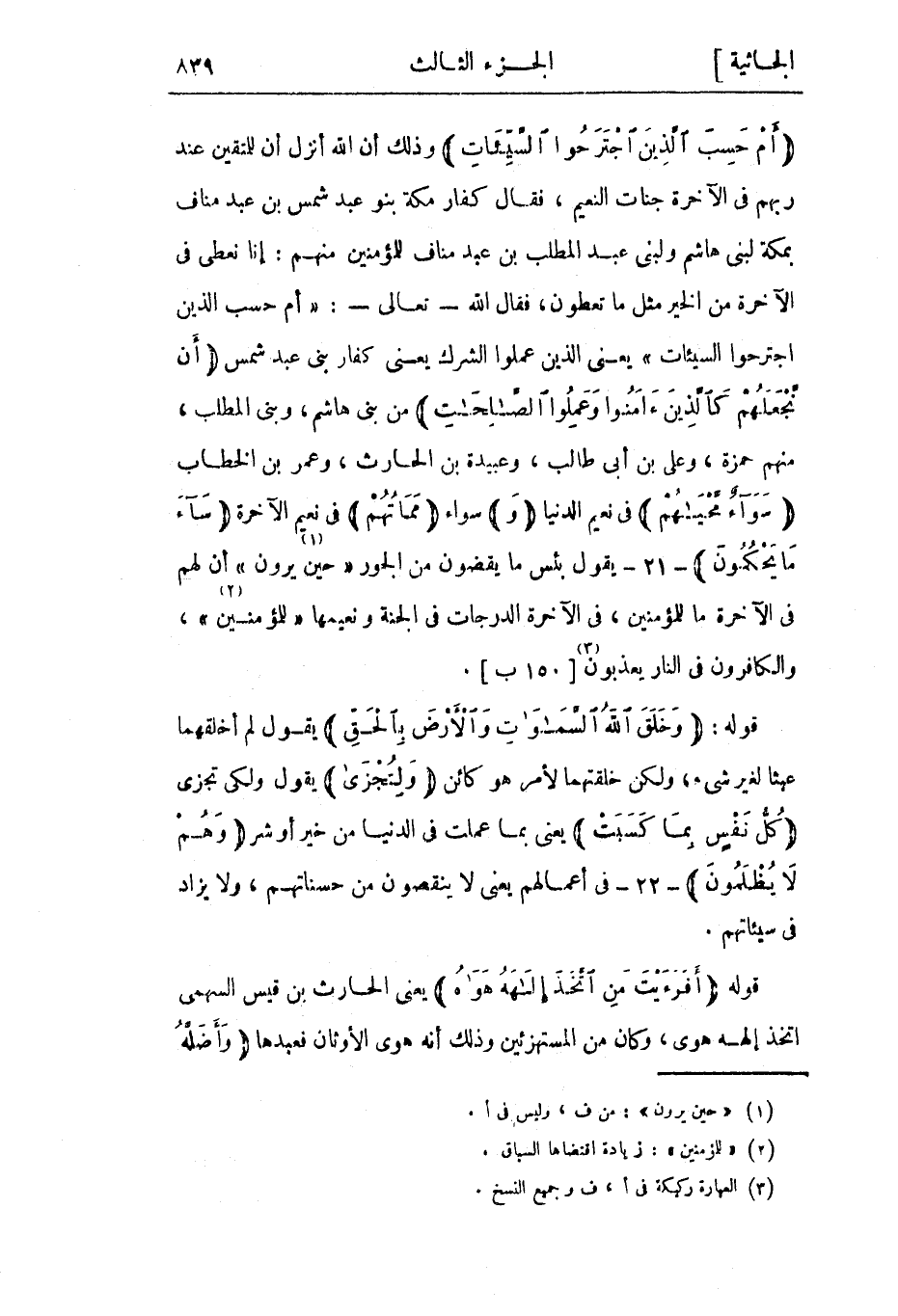 وذلك أن الله أنزل أن للمتقين عند ربهم في الآخرة جنات النعيم، فقال كفار مكة بنو عبد شمس بن عبد مناف بمكة لبني هاشم ولبني عبد المطلب بن عبد مناف للمؤمنين منهم: إنا نعطى في الآخرة من الخير مثل ما تعطون، فقال الله- تعالى-: «أَمْ حَسِبَ الَّذِينَ اجْتَرَحُوا السَّيِّئَاتِ» يعني الذين عملوا الشرك يعني كفار بني عبد شمس أَنْ نَجْعَلَهُمْ كَالَّذِينَ آمَنُوا وَعَمِلُوا الصَّالِحاتِ