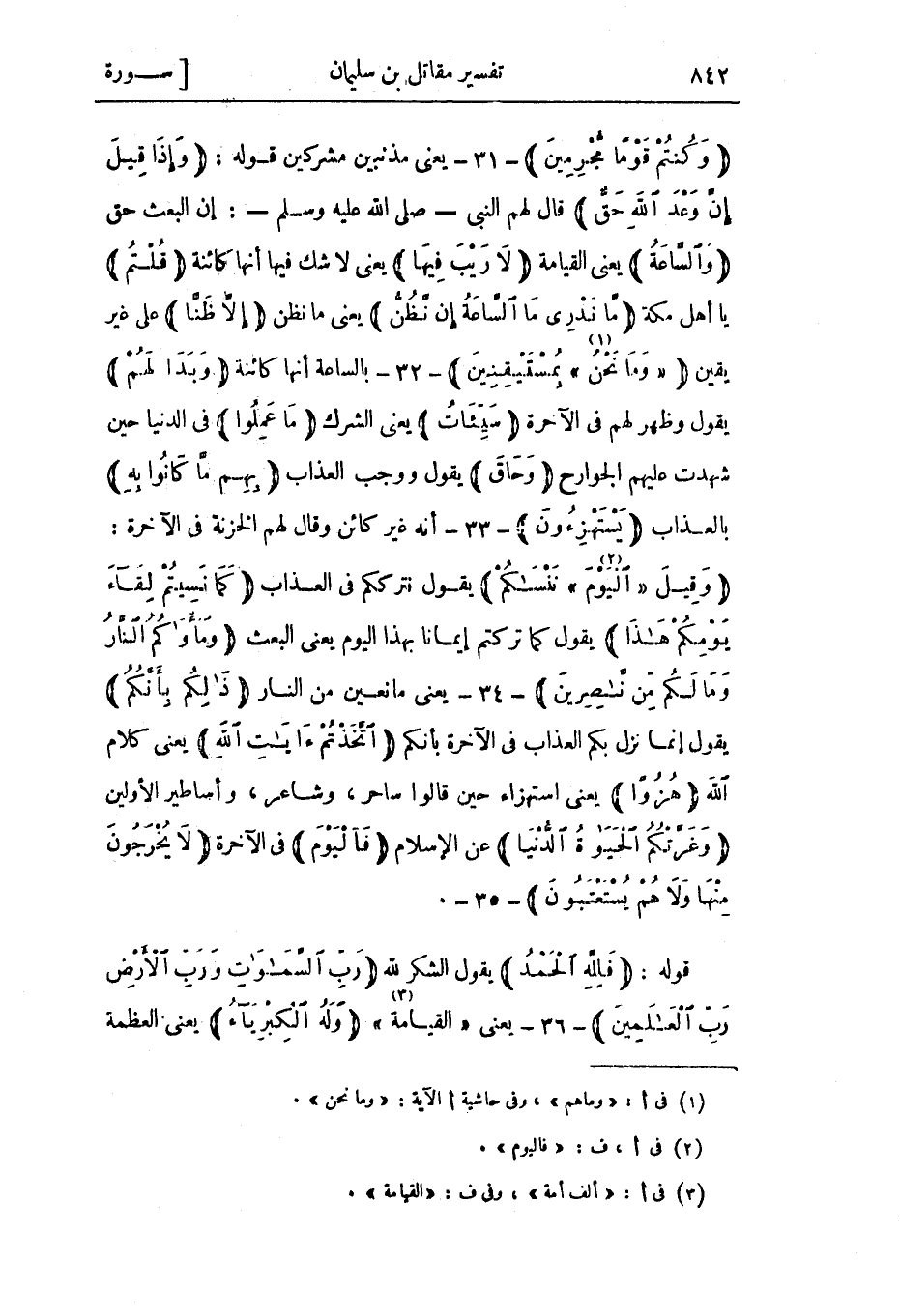 وَكُنْتُمْ قَوْماً مُجْرِمِينَ- 31- يعني مذنبين مشركين قوله: وَإِذا قِيلَ إِنَّ وَعْدَ اللَّهِ حَقٌّ قال لهم النبي- صلى الله عليه وسلم-: إن البعث حق وَالسَّاعَةُ يعني القيامة لا رَيْبَ فِيها يعني لا شك فيها أنها كائنة قُلْتُمْ يا أهل مكة مَا نَدْرِي مَا السَّاعَةُ إِنْ نَظُنُّ يعني ما نظن إِلَّا ظَنًّا على غير يقين «وَما نَحْنُ» «1» بِمُسْتَيْقِنِينَ- 32- بالساعة أنها كائنة وَبَدا لَهُمْ يقول وظهر لهم في الآخرة سَيِّئاتُ يعني الشرك مَا عَمِلُوا في الدنيا حين شهدت عليهم الجوارح وَحاقَ يقول ووجب العذاب بِهِمْ مَا كانُوا بِهِ بالعذاب يَسْتَهْزِؤُنَ- 33- أنه غير كائن وقال لهم الخزنة في الآخرة: