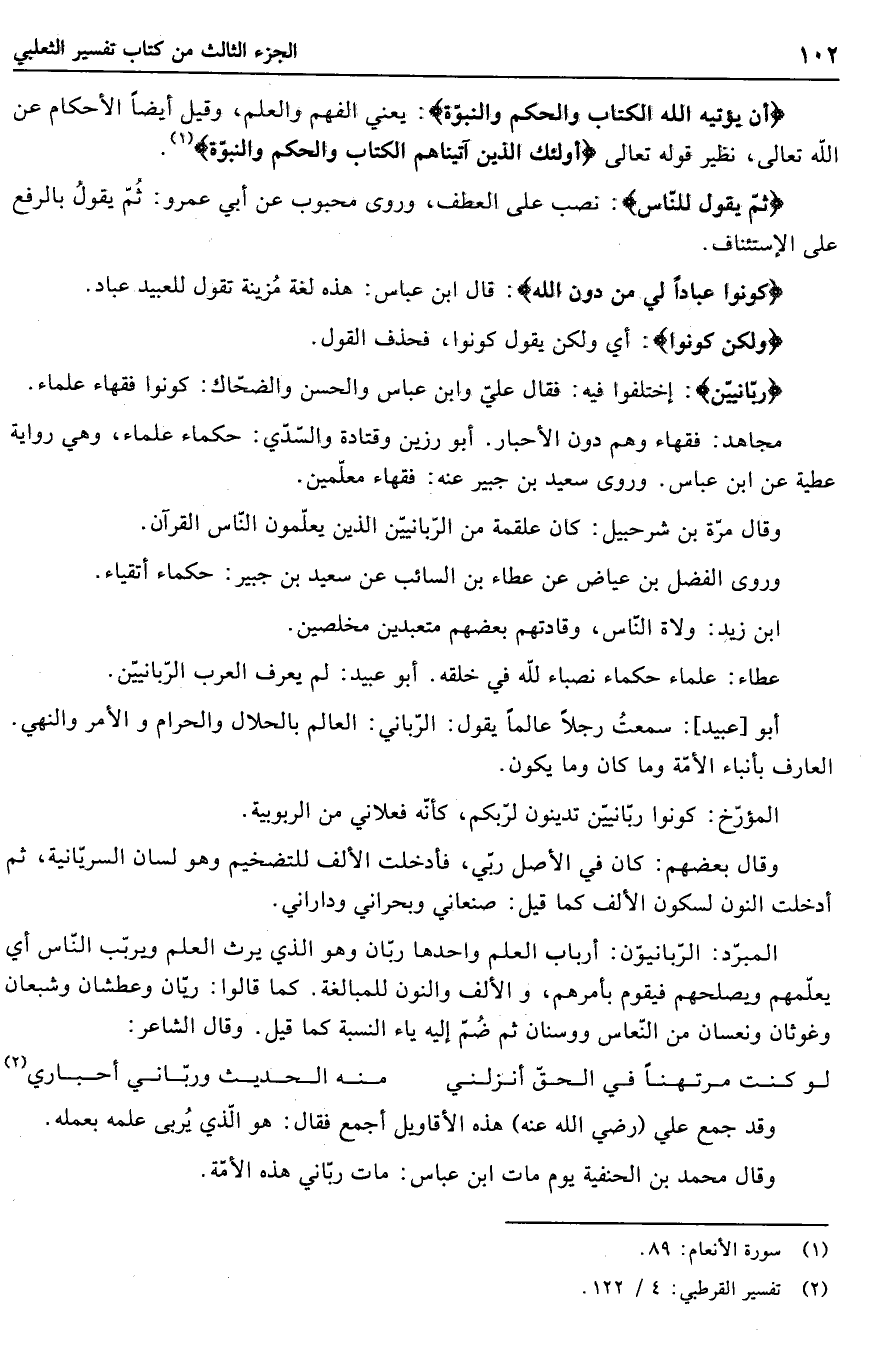 المبّرد: الرّبانيون: أرباب العلم واحدها ربّان وهو الذي يرث العلم ويربّب النّاس أي يعلّمهم ويصلحهم فيقوم بأمرهم، والألف والنون للمبالغة. كما قالوا: ريّان وعطشان وشبعان وغوثان ونعسان من النّعاس ووسنان ثم ضمّ إليه ياء النسبة كما قيل. وقال الشاعر: