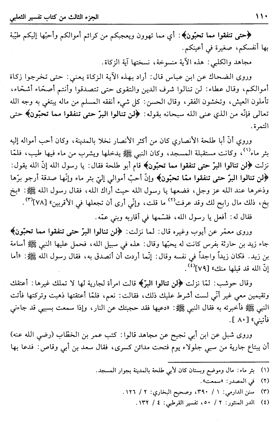 وروي أنّ أبا طلحة الأنصاري كان من أكثر الأنصار نخلا بالمدينة، وكان أحب أمواله إليه بئر ماء «1» ، وكانت مستقبلة المسجد، وكان النبي صلّى الله عليه وسلّم يدخلها ويشرب من ماء فيها طيب، فلمّا نزلت لَنْ تَنالُوا الْبِرَّ حَتَّى تُنْفِقُوا مِمَّا تُحِبُّونَ قام أبو طلحة فقال: يا رسول الله إنّ الله يقول: