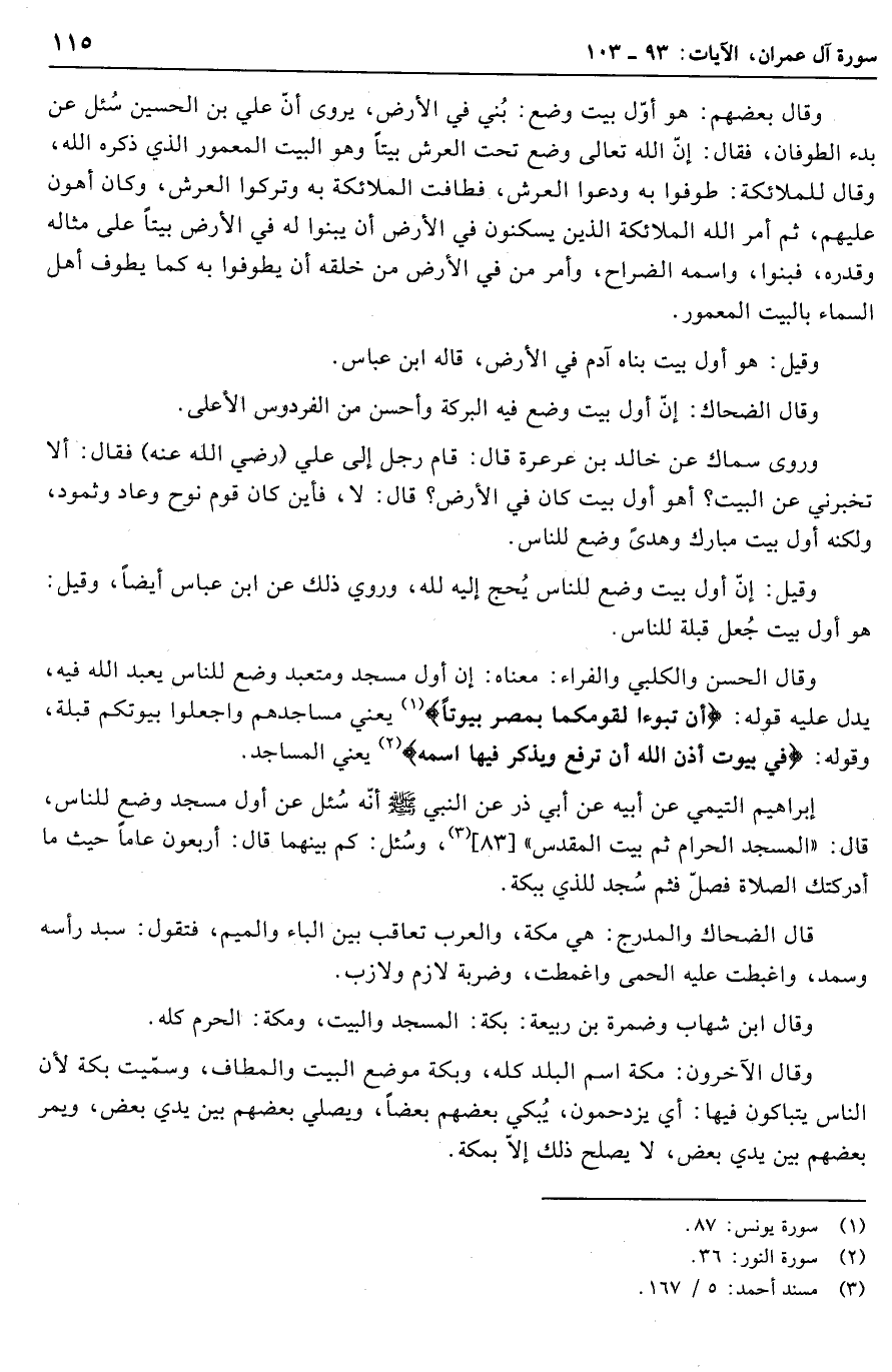 وقال الحسن والكلبي والفراء: معناه: إن أول مسجد ومتعبد وضع للناس يعبد الله فيه، يدل عليه قوله: أَنْ تَبَوَّءا لِقَوْمِكُما بِمِصْرَ بُيُوتاً «1» يعني مساجدهم وَاجْعَلُوا بُيُوتَكُمْ قِبْلَةً، وقوله: فِي بُيُوتٍ أَذِنَ اللَّهُ أَنْ تُرْفَعَ وَيُذْكَرَ فِيهَا اسْمُهُ «2» يعني المساجد.