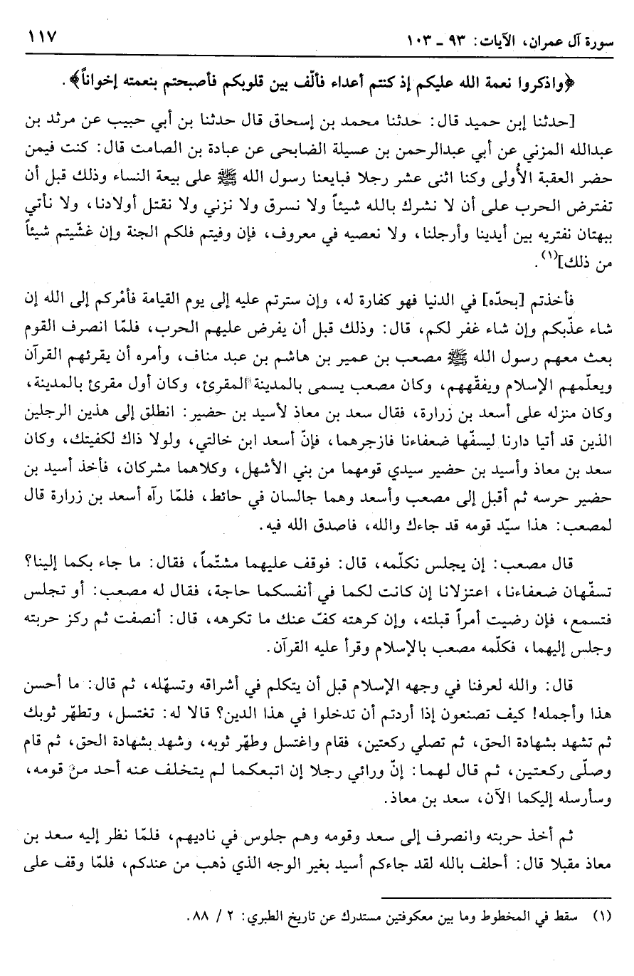[حدثنا ابن حميد قال: حدثنا محمد بن إسحاق قال حدثنا بن أبي حبيب عن مرثد بن عبد الله المزني عن أبي عبد الرحمن بن عسيلة الضابحى عن عبادة بن الصامت قال: كنت فيمن حضر العقبة الأولى وكنا اثنى عشر رجلا فبايعنا رسول الله صلّى الله عليه وسلّم على بيعة النساء وذلك قبل أن تفترض الحرب على أن لا نشرك بالله شيئا ولا نسرق ولا نزني ولا نقتل أولادنا، ولا نأتي ببهتان نفتريه بين أيدينا وأرجلنا، ولا نعصيه في معروف، فإن وفيتم فلكم الجنة وإن غشّيتم شيئا من ذلك] «1» .