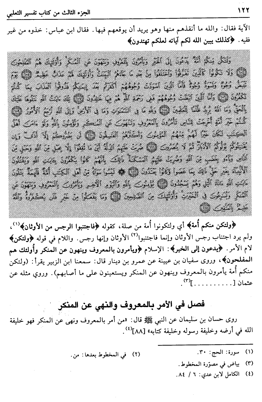 وَلْتَكُنْ مِنْكُمْ أُمَّةٌ يَدْعُونَ إِلَى الْخَيْرِ وَيَأْمُرُونَ بِالْمَعْرُوفِ وَيَنْهَوْنَ عَنِ الْمُنْكَرِ وَأُولئِكَ هُمُ الْمُفْلِحُونَ (104) وَلا تَكُونُوا كَالَّذِينَ تَفَرَّقُوا وَاخْتَلَفُوا مِنْ بَعْدِ ما جاءَهُمُ الْبَيِّناتُ وَأُولئِكَ لَهُمْ عَذابٌ عَظِيمٌ (105) يَوْمَ تَبْيَضُّ وُجُوهٌ وَتَسْوَدُّ وُجُوهٌ فَأَمَّا الَّذِينَ اسْوَدَّتْ وُجُوهُهُمْ أَكَفَرْتُمْ بَعْدَ إِيمانِكُمْ فَذُوقُوا الْعَذابَ بِما كُنْتُمْ تَكْفُرُونَ (106) وَأَمَّا الَّذِينَ ابْيَضَّتْ وُجُوهُهُمْ فَفِي رَحْمَتِ اللَّهِ هُمْ فِيها خالِدُونَ (107) تِلْكَ آياتُ اللَّهِ نَتْلُوها عَلَيْكَ بِالْحَقِّ وَمَا اللَّهُ يُرِيدُ ظُلْماً لِلْعالَمِينَ (108)