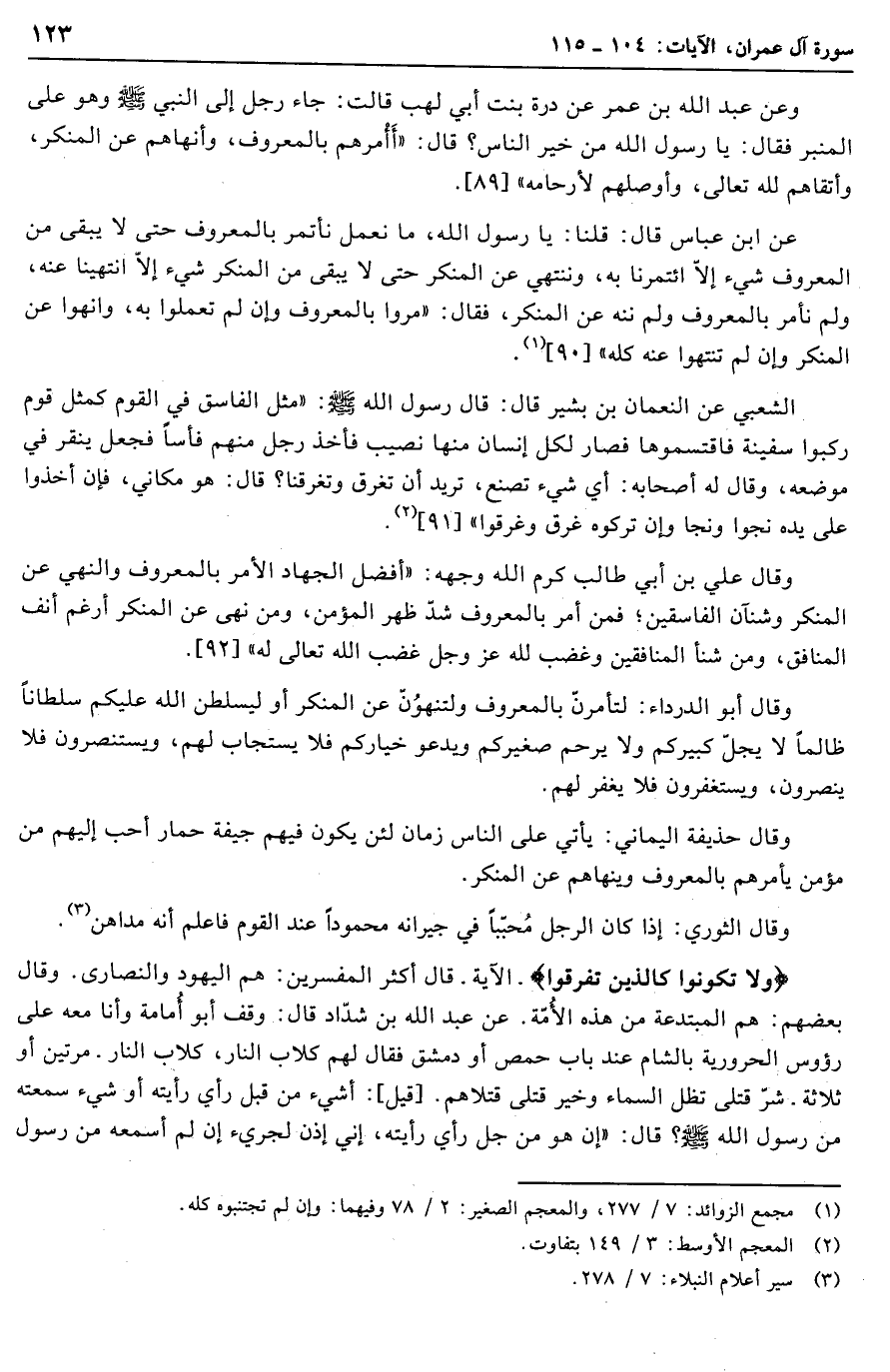 عن ابن عباس قال: قلنا: يا رسول الله، ما نعمل نأتمر بالمعروف حتى لا يبقى من المعروف شيء إلّا ائتمرنا به، وننتهي عن المنكر حتى لا يبقى من المنكر شيء إلّا انتهينا عنه، ولم نأمر بالمعروف ولم ننه عن المنكر، فقال: «مروا بالمعروف وإن لم تعملوا به، وانهوا عن المنكر وإن لم تنتهوا عنه كله» [90] «1» .