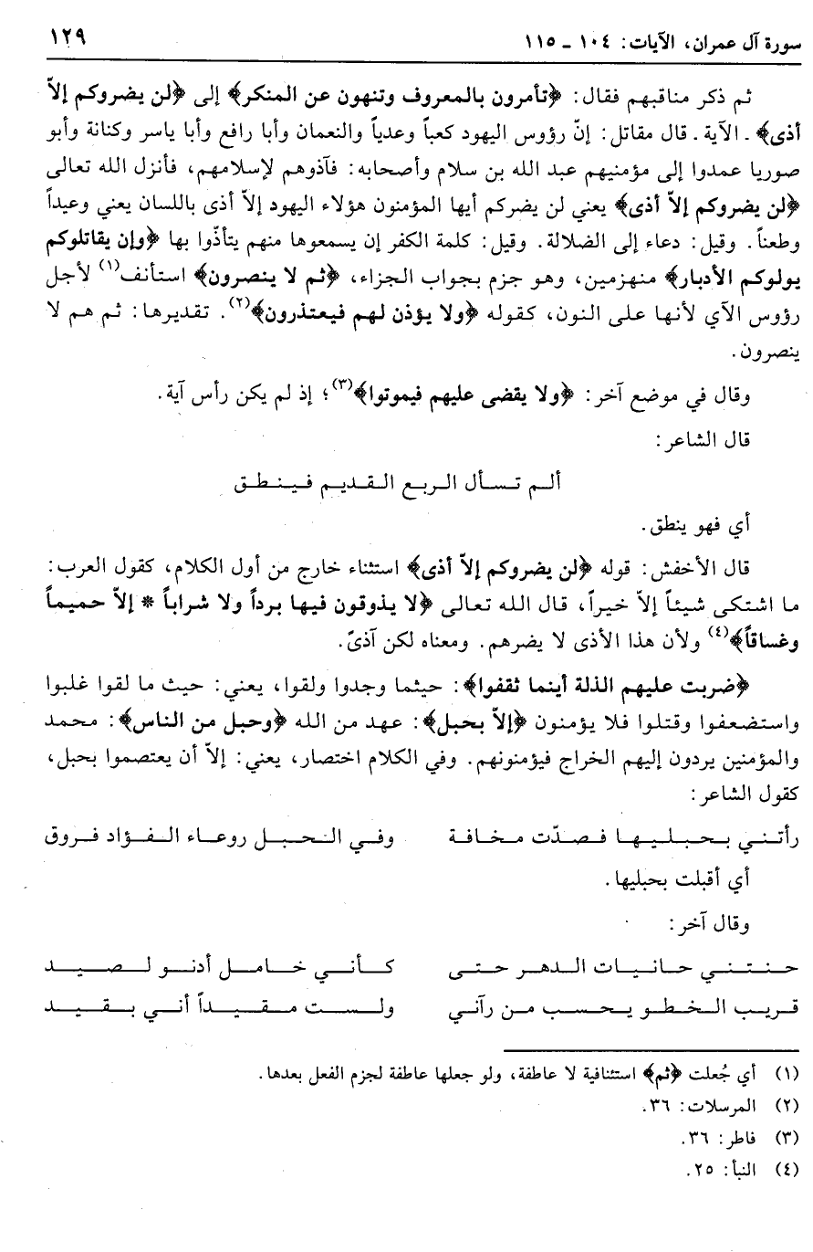 ثم ذكر مناقبهم فقال: تَأْمُرُونَ بِالْمَعْرُوفِ وَتَنْهَوْنَ عَنِ الْمُنْكَرِ إلى لَنْ يَضُرُّوكُمْ إِلَّا أَذىً. الآية. قال مقاتل: إنّ رؤوس اليهود كعبا وعديا والنعمان وأبا رافع وأبا ياسر وكنانة وأبو صوريا عمدوا إلى مؤمنيهم عبد الله بن سلام وأصحابه: فآذوهم لإسلامهم، فأنزل الله تعالى لَنْ يَضُرُّوكُمْ إِلَّا أَذىً يعني لن يضركم أيها المؤمنون هؤلاء اليهود إلّا أذى باللسان يعني وعيدا وطعنا. وقيل: دعاء إلى الضلالة. وقيل: كلمة الكفر إن يسمعوها منهم يتأذّوا بها وَإِنْ يُقاتِلُوكُمْ يُوَلُّوكُمُ الْأَدْبارَ منهزمين، وهو جزم بجواب الجزاء، ثُمَّ لا يُنْصَرُونَ استأنف «1» لأجل رؤوس الآي لأنها على النون، كقوله وَلا يُؤْذَنُ لَهُمْ فَيَعْتَذِرُونَ «2» . تقديرها: ثم هم لا ينصرون.