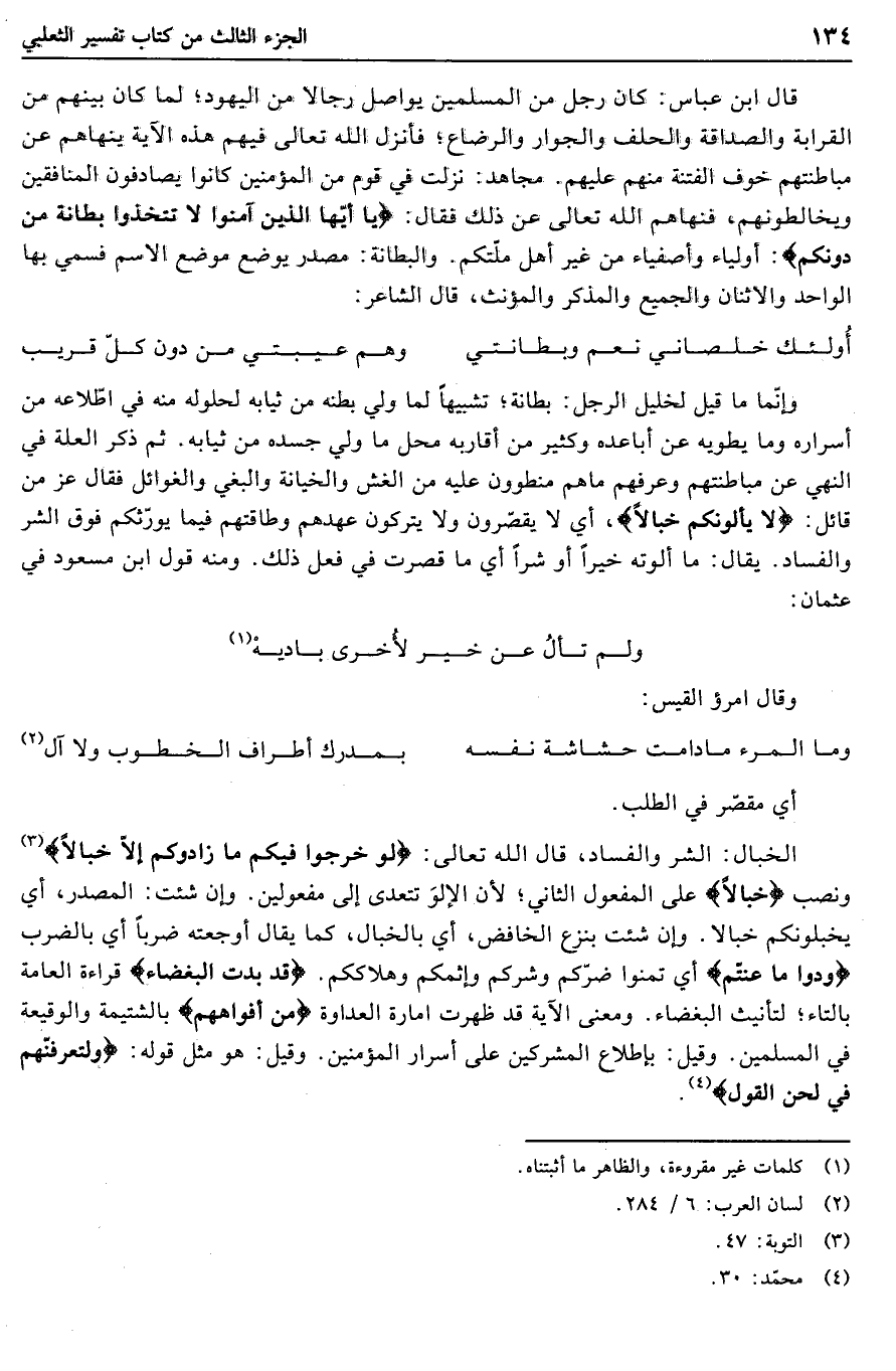 قال ابن عباس: كان رجل من المسلمين يواصل رجالا من اليهود لما كان بينهم من القرابة والصداقة والحلف والجوار والرضاع فأنزل الله تعالى فيهم هذه الآية ينهاهم عن مباطنتهم خوف الفتنة منهم عليهم. مجاهد: نزلت في قوم من المؤمنين كانوا يصادفون المنافقين ويخالطونهم، فنهاهم الله تعالى عن ذلك فقال: يا أَيُّهَا الَّذِينَ آمَنُوا لا تَتَّخِذُوا بِطانَةً مِنْ دُونِكُمْ: أولياء وأصفياء من غير أهل ملّتكم. والبطانة: مصدر يوضع موضع الاسم فسمي بها الواحد والاثنان والجميع والمذكر والمؤنث، قال الشاعر: