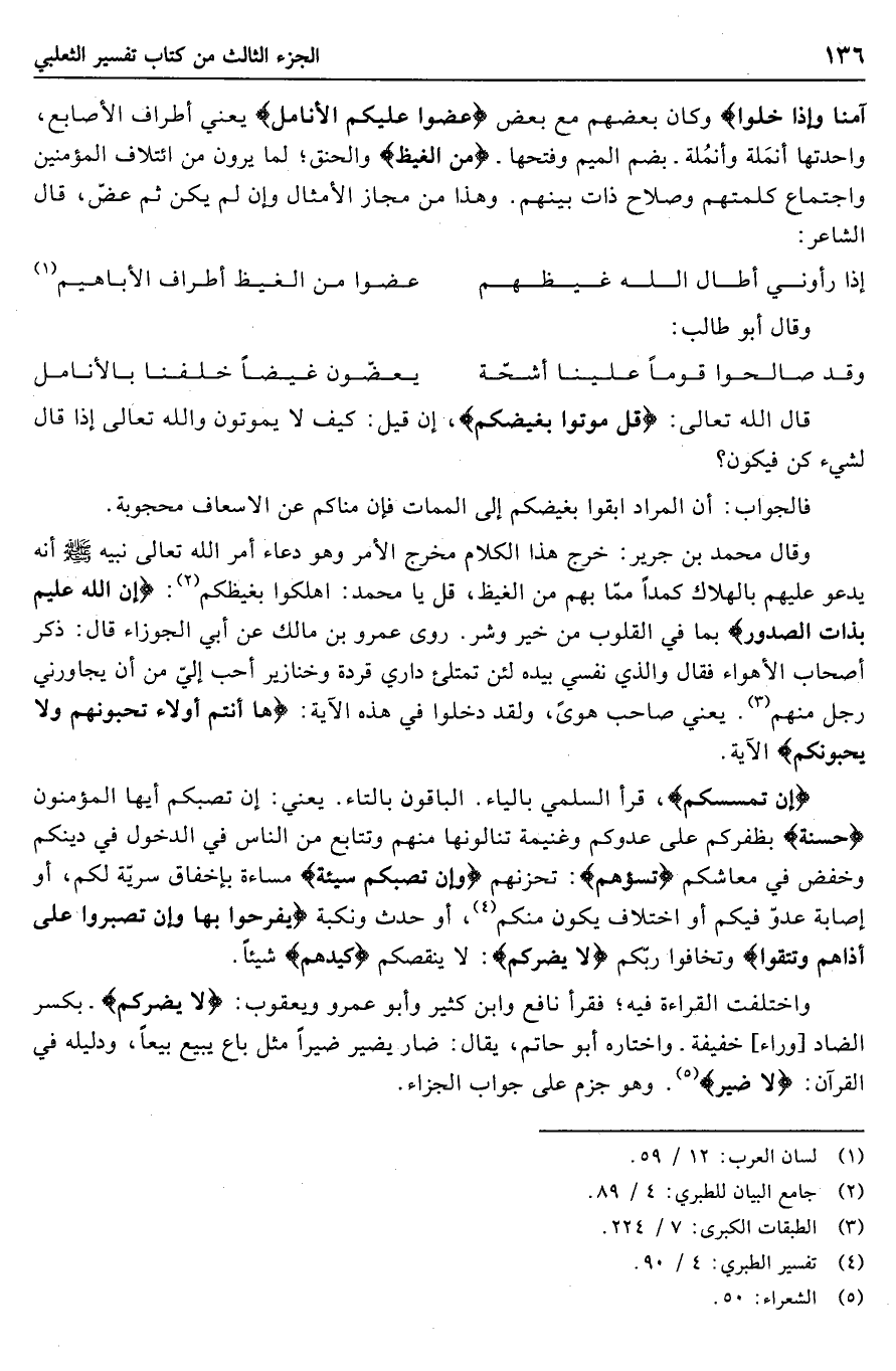 وكان بعضهم مع بعض عَضُّوا عَلَيْكُمُ الْأَنامِلَ يعني أطراف الأصابع، واحدتها أنملة وأنملة. بضم الميم وفتحها. مِنَ الْغَيْظِ والحنق لما يرون من ائتلاف المؤمنين واجتماع كلمتهم وصلاح ذات بينهم. وهذا من مجاز الأمثال وإن لم يكن ثم عضّ، قال الشاعر: