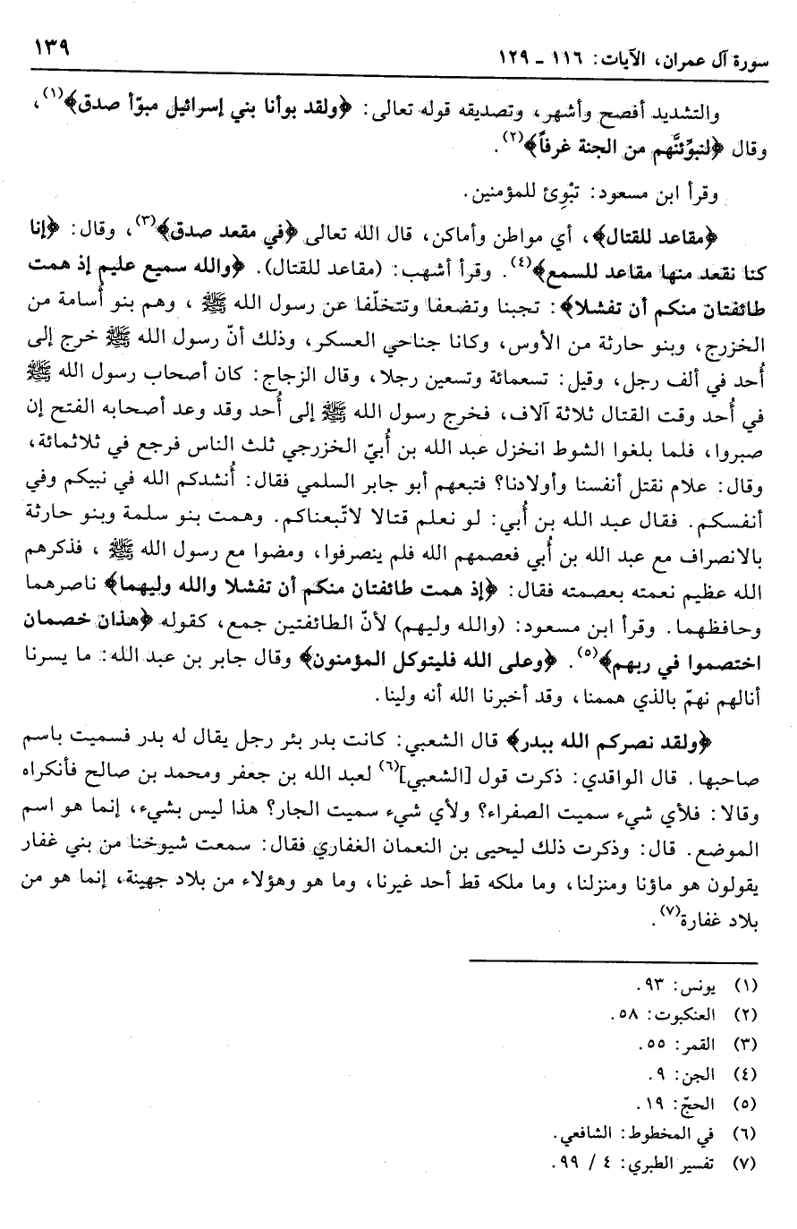 وَلَقَدْ نَصَرَكُمُ اللَّهُ بِبَدْرٍ قال الشعبي: كانت بدر بئر رجل يقال له بدر فسميت باسم صاحبها. قال الواقدي: ذكرت قول [الشعبي] «6» لعبد الله بن جعفر ومحمد بن صالح فأنكراه وقالا: فلأي شيء سميت الصفراء؟ ولأي شيء سميت الجار؟ هذا ليس بشيء، إنما هو اسم الموضع. قال: وذكرت ذلك ليحيى بن النعمان الغفاري فقال: سمعت شيوخنا من بني غفار يقولون هو ماؤنا ومنزلنا، وما ملكه قط أحد غيرنا، وما هو وهؤلاء من بلاد جهينة، إنما هو من بلاد غفارة «7» .