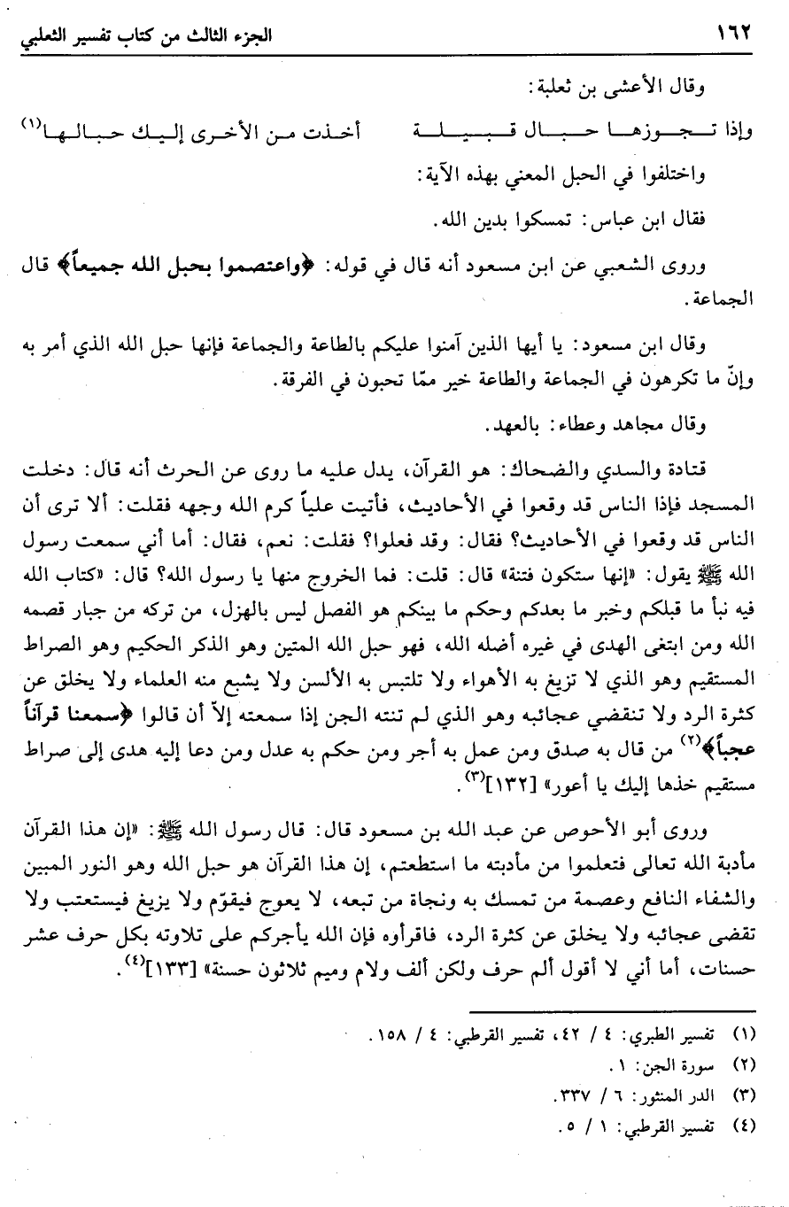وروى الشعبي عن ابن مسعود أنه قال في قوله: وَاعْتَصِمُوا بِحَبْلِ اللَّهِ جَمِيعاً قال الجماعة.