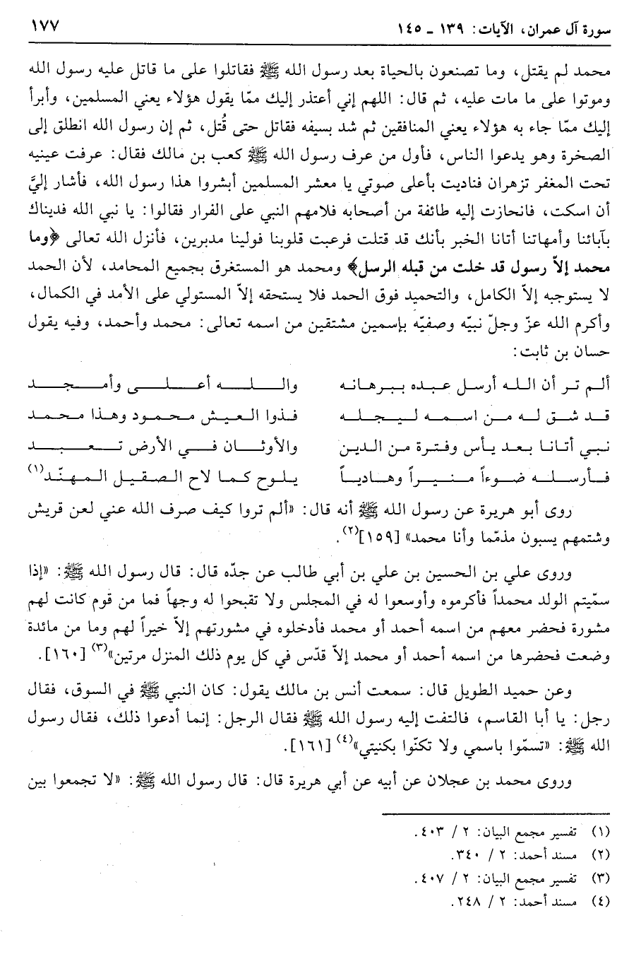 محمد لم يقتل، وما تصنعون بالحياة بعد رسول الله صلّى الله عليه وسلّم فقاتلوا على ما قاتل عليه رسول الله وموتوا على ما مات عليه، ثم قال: اللهم إني أعتذر إليك ممّا يقول هؤلاء يعني المسلمين، وأبرأ إليك ممّا جاء به هؤلاء يعني المنافقين ثم شد بسيفه فقاتل حتى قتل، ثم إن رسول الله انطلق إلى الصخرة وهو يدعوا الناس، فأول من عرف رسول الله صلّى الله عليه وسلّم كعب بن مالك فقال: عرفت عينيه تحت المغفر تزهران فناديت بأعلى صوتي يا معشر المسلمين أبشروا هذا رسول الله، فأشار إليّ أن اسكت، فانحازت إليه طائفة من أصحابه فلامهم النبي على الفرار فقالوا: يا نبي الله فديناك بآبائنا وأمهاتنا أتانا الخبر بأنك قد قتلت فرعبت قلوبنا فولينا مدبرين، فأنزل الله تعالى وَما مُحَمَّدٌ إِلَّا رَسُولٌ قَدْ خَلَتْ مِنْ قَبْلِهِ الرُّسُلُ ومحمد هو المستغرق بجميع المحامد، لأن الحمد لا يستوجبه إلّا الكامل، والتحميد فوق الحمد فلا يستحقه إلّا المستولي على الأمد في الكمال، وأكرم الله عزّ وجلّ نبيّه وصفيّه باسمين مشتقين من اسمه تعالى: محمد وأحمد، وفيه يقول حسان بن ثابت: