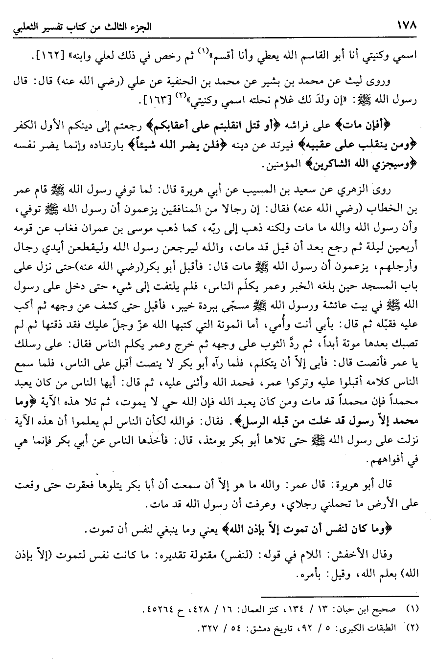 روى الزهري عن سعيد بن المسيب عن أبي هريرة قال: لما توفي رسول الله صلّى الله عليه وسلّم قام عمر بن الخطاب (رضي الله عنه) فقال: إن رجالا من المنافقين يزعمون أن رسول الله صلّى الله عليه وسلّم توفي، وأن رسول الله والله ما مات ولكنه ذهب إلى ربّه، كما ذهب موسى بن عمران فغاب عن قومه أربعين ليلة ثم رجع بعد أن قيل قد مات، والله ليرجعن رسول الله وليقطعن أيدي رجال وأرجلهم، يزعمون أن رسول الله صلّى الله عليه وسلّم مات قال: فأقبل أبو بكر (رضي الله عنه) حتى نزل على باب المسجد حين بلغه الخبر وعمر يكلّم الناس، فلم يلتفت إلى شيء حتى دخل على رسول الله صلّى الله عليه وسلّم في بيت عائشة ورسول الله صلّى الله عليه وسلّم مسجّى ببردة خيبر، فأقبل حتى كشف عن وجهه ثم أكب عليه فقبّله ثم قال: بأبي أنت وأمي، أما الموتة التي كتبها الله عزّ وجلّ عليك فقد ذقتها ثم لم تصبك بعدها موتة أبدا، ثم ردّ الثوب على وجهه ثم خرج وعمر يكلم الناس فقال: على رسلك يا عمر فأنصت قال: فأبى إلّا أن يتكلم، فلما رآه أبو بكر لا ينصت أقبل على الناس، فلما سمع الناس كلامه أقبلوا عليه وتركوا عمر، فحمد الله وأثنى عليه، ثم قال: أيها الناس من كان يعبد محمدا فإن محمدا قد مات ومن كان يعبد الله فإن الله حي لا يموت، ثم تلا هذه الآية وَما مُحَمَّدٌ إِلَّا رَسُولٌ قَدْ خَلَتْ مِنْ قَبْلِهِ الرُّسُلُ. فقال: فو الله لكأن الناس لم يعلموا أن هذه الآية نزلت على رسول الله صلّى الله عليه وسلّم حتى تلاها أبو بكر يومئذ، قال: فأخذها الناس عن أبي بكر فإنما هي في أفواههم.