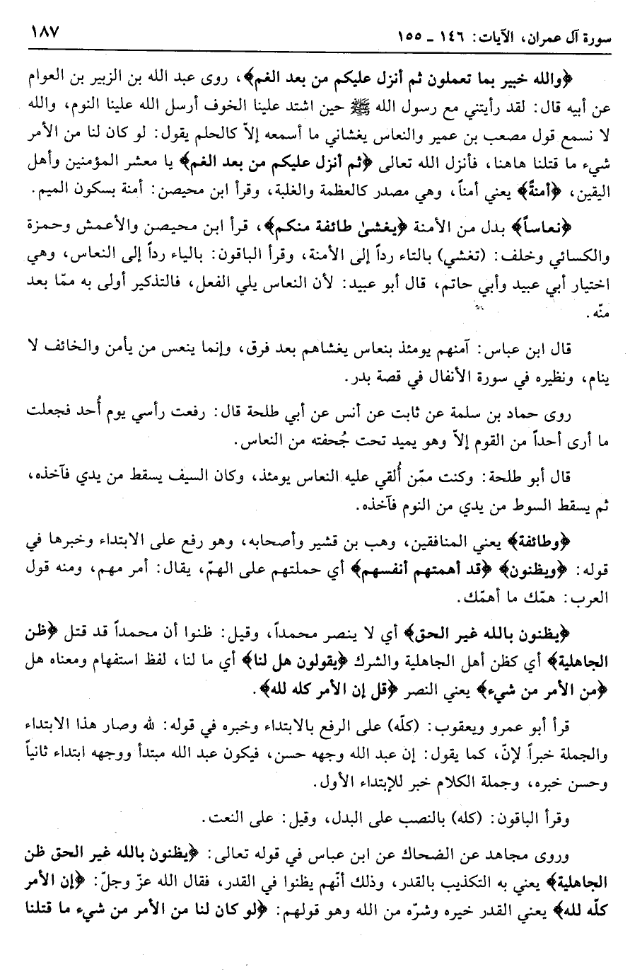 نُعاساً بدل من الأمنة يَغْشى طائِفَةً مِنْكُمْ، قرأ ابن محيصن والأعمش وحمزة والكسائي وخلف: (تغشي) بالتاء ردا إلى الأمنة، وقرأ الباقون: بالياء ردا إلى النعاس، وهي اختيار أبي عبيد وأبي حاتم، قال أبو عبيد: لأن النعاس يلي الفعل، فالتذكير أولى به ممّا بعد منّه.