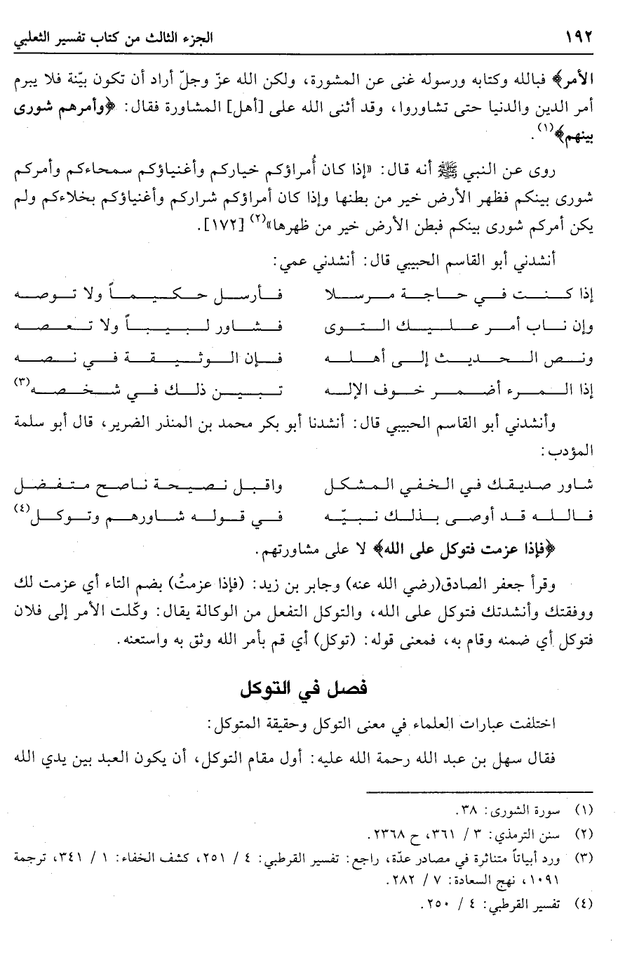 وَشاوِرْهُمْ فِي الْأَمْرِ فبالله وكتابه ورسوله غنى عن المشورة، ولكن الله عزّ وجلّ أراد أن تكون بيّنة فلا يبرم أمر الدين والدنيا حتى تشاوروا، وقد أثنى الله على [أهل] المشاورة فقال: وَأَمْرُهُمْ شُورى بَيْنَهُمْ «1» .