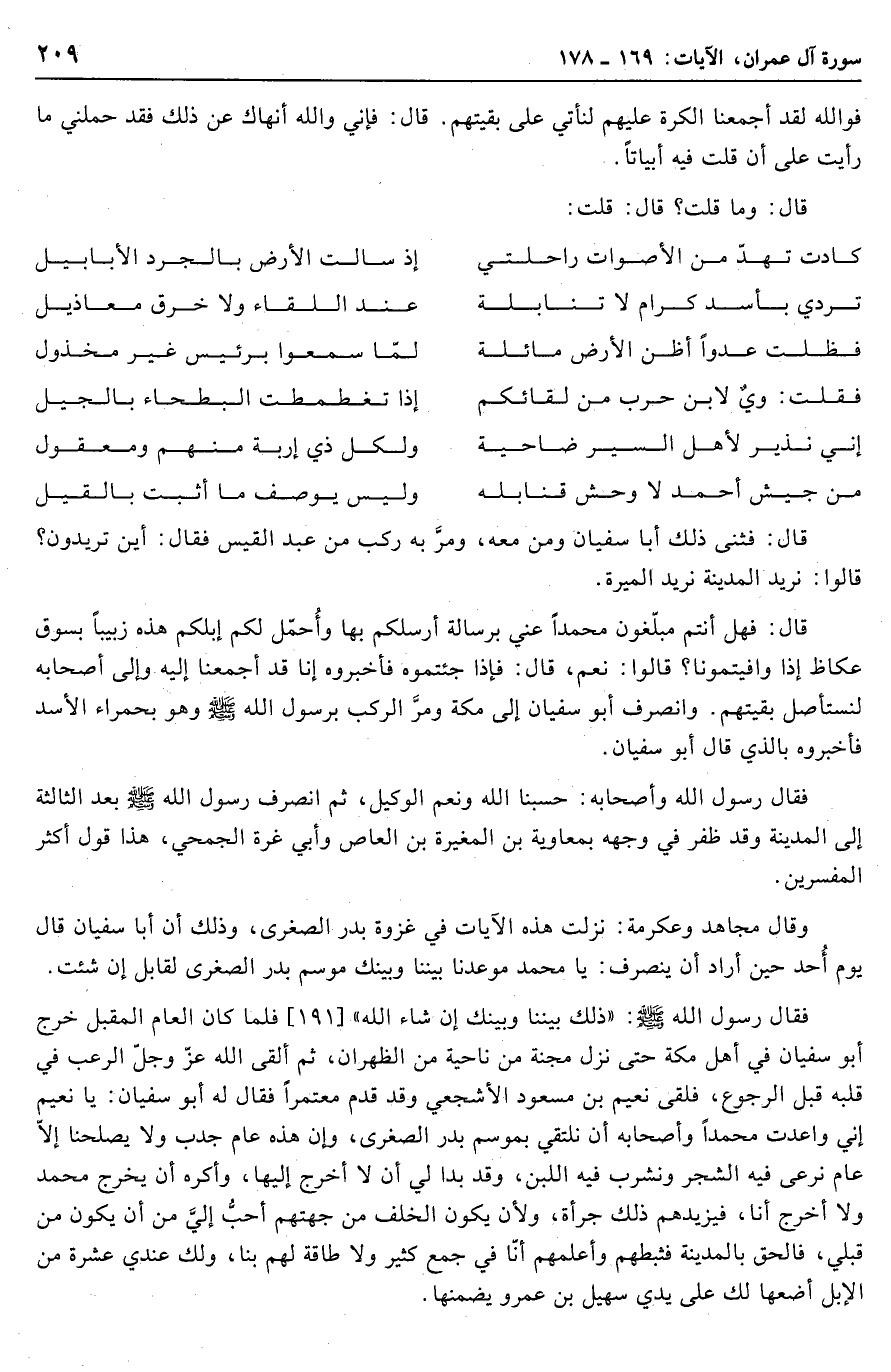 قال: فهل أنتم مبلّغون محمدا عني برسالة أرسلكم بها وأحمّل لكم إبلكم هذه زبيبا بسوق عكاظ إذا وافيتمونا؟ قالوا: نعم، قال: فإذا جئتموه فأخبروه إنا قد أجمعنا إليه وإلى أصحابه لنستأصل بقيتهم. وانصرف أبو سفيان إلى مكة ومرّ الركب برسول الله صلّى الله عليه وسلّم وهو بحمراء الأسد فأخبروه بالذي قال أبو سفيان.