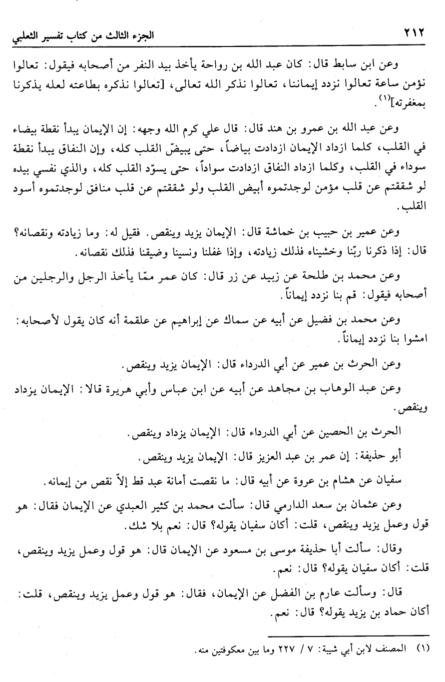 وعن عثمان بن سعد الدارمي قال: سألت محمد بن كثير العبدي عن الإيمان فقال: هو قول وعمل يزيد وينقص، قلت: أكان سفيان يقوله؟ قال: نعم بلا شك.