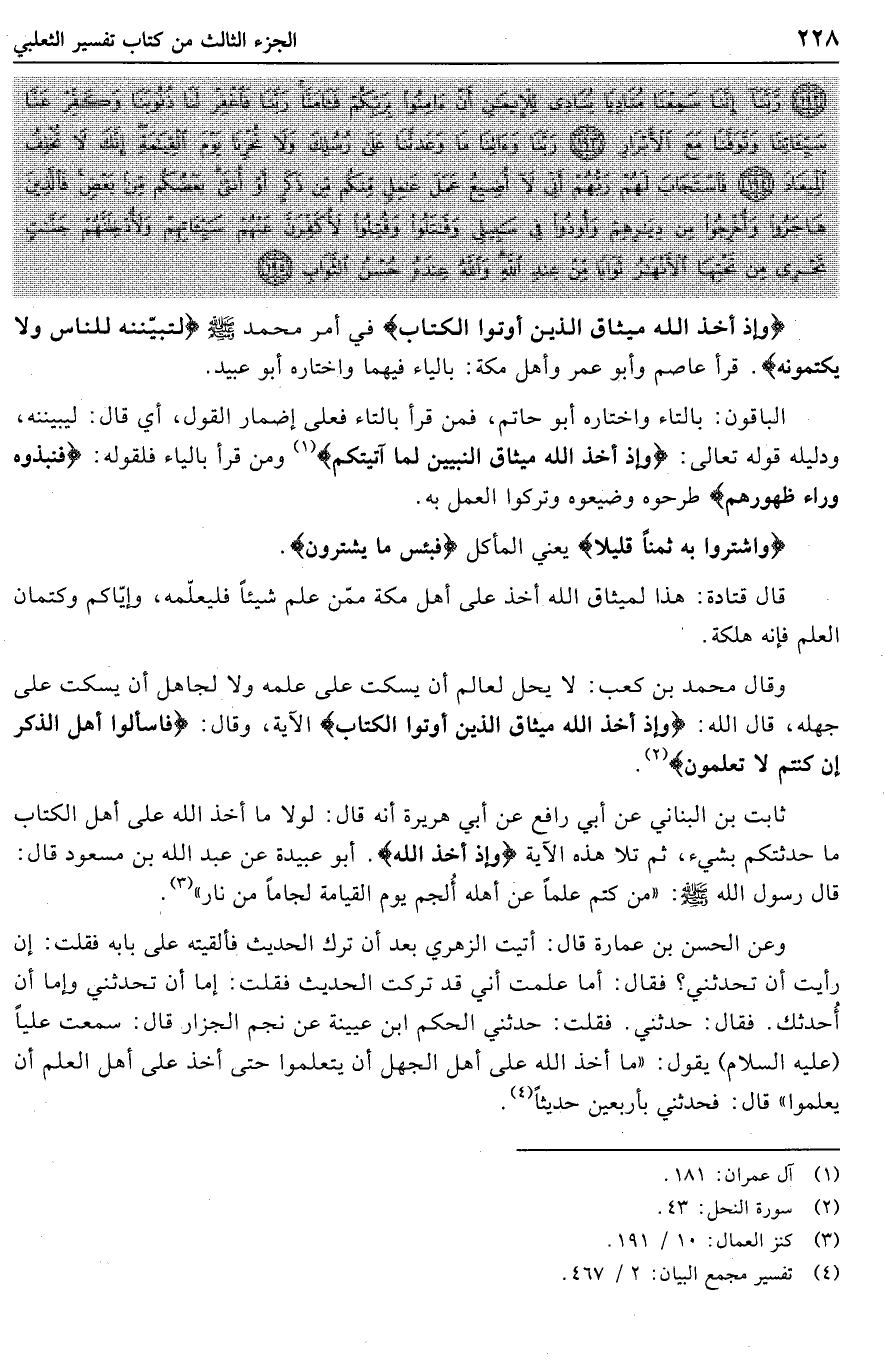 وقال محمد بن كعب: لا يحل لعالم أن يسكت على علمه ولا لجاهل أن يسكت على جهله، قال الله: وَإِذْ أَخَذَ اللَّهُ مِيثاقَ الَّذِينَ أُوتُوا الْكِتابَ الآية، وقال: فَسْئَلُوا أَهْلَ الذِّكْرِ إِنْ كُنْتُمْ لا تَعْلَمُونَ «2» .