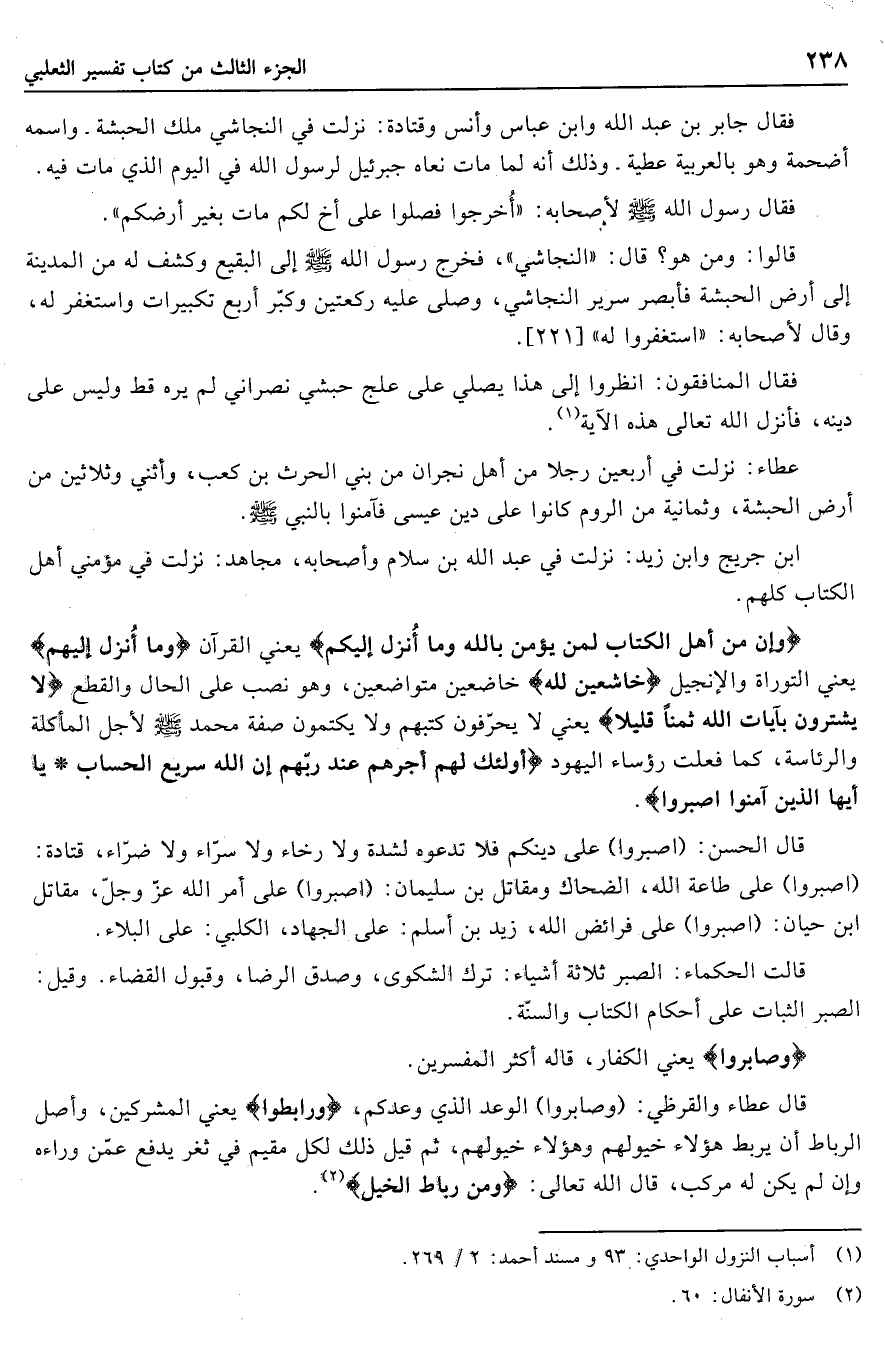 وَإِنَّ مِنْ أَهْلِ الْكِتابِ لَمَنْ يُؤْمِنُ بِاللَّهِ وَما أُنْزِلَ إِلَيْكُمْ يعني القرآن وَما أُنْزِلَ إِلَيْهِمْ يعني التوراة والإنجيل خاشِعِينَ لِلَّهِ خاضعين متواضعين، وهو نصب على الحال والقطع لا يَشْتَرُونَ بِآياتِ اللَّهِ ثَمَناً قَلِيلًا يعني لا يحرّفون كتبهم ولا يكتمون صفة محمد صلّى الله عليه وسلّم لأجل المأكلة والرئاسة، كما فعلت رؤساء اليهود أُولئِكَ لَهُمْ أَجْرُهُمْ عِنْدَ رَبِّهِمْ إِنَّ اللَّهَ سَرِيعُ الْحِسابِ. يا أَيُّهَا الَّذِينَ آمَنُوا اصْبِرُوا.