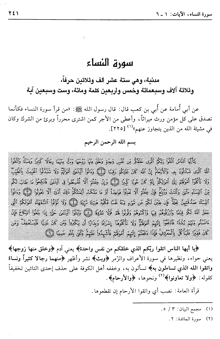 يا أَيُّهَا النَّاسُ اتَّقُوا رَبَّكُمُ الَّذِي خَلَقَكُمْ مِنْ نَفْسٍ واحِدَةٍ وَخَلَقَ مِنْها زَوْجَها وَبَثَّ مِنْهُما رِجالاً كَثِيراً وَنِساءً وَاتَّقُوا اللَّهَ الَّذِي تَسائَلُونَ بِهِ وَالْأَرْحامَ إِنَّ اللَّهَ كانَ عَلَيْكُمْ رَقِيباً (1) وَآتُوا الْيَتامى أَمْوالَهُمْ وَلا تَتَبَدَّلُوا الْخَبِيثَ بِالطَّيِّبِ وَلا تَأْكُلُوا أَمْوالَهُمْ إِلى أَمْوالِكُمْ إِنَّهُ كانَ حُوباً كَبِيراً (2) وَإِنْ خِفْتُمْ أَلاَّ تُقْسِطُوا فِي الْيَتامى فَانْكِحُوا ما طابَ لَكُمْ مِنَ النِّساءِ مَثْنى وَثُلاثَ وَرُباعَ فَإِنْ خِفْتُمْ أَلاَّ تَعْدِلُوا فَواحِدَةً أَوْ ما مَلَكَتْ أَيْمانُكُمْ ذلِكَ أَدْنى أَلاَّ تَعُولُوا (3) وَآتُوا النِّساءَ صَدُقاتِهِنَّ نِحْلَةً فَإِنْ طِبْنَ لَكُمْ عَنْ شَيْءٍ مِنْهُ نَفْساً فَكُلُوهُ هَنِيئاً مَرِيئاً (4)