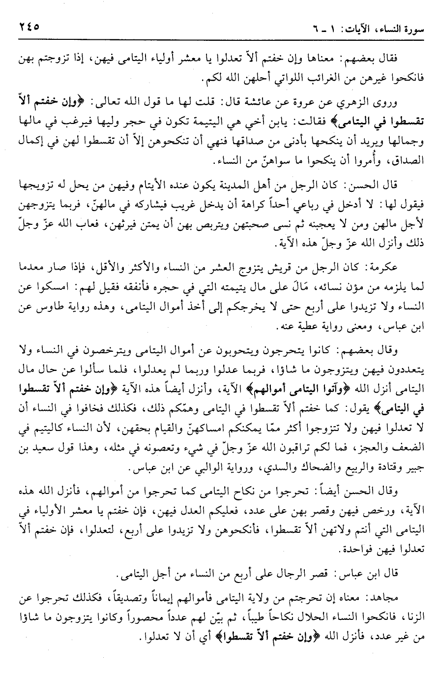 وروى الزهري عن عروة عن عائشة قال: قلت لها ما قول الله تعالى: وَإِنْ خِفْتُمْ أَلَّا تُقْسِطُوا فِي الْيَتامى فقالت: يا ابن أخي هي اليتيمة تكون في حجر وليها فيرغب في مالها وجمالها ويريد أن ينكحها بأدنى من صداقها فنهي أن تنكحوهن إلّا أن تقسطوا لهن في إكمال الصداق، وأمروا أن ينكحوا ما سواهنّ من النساء.